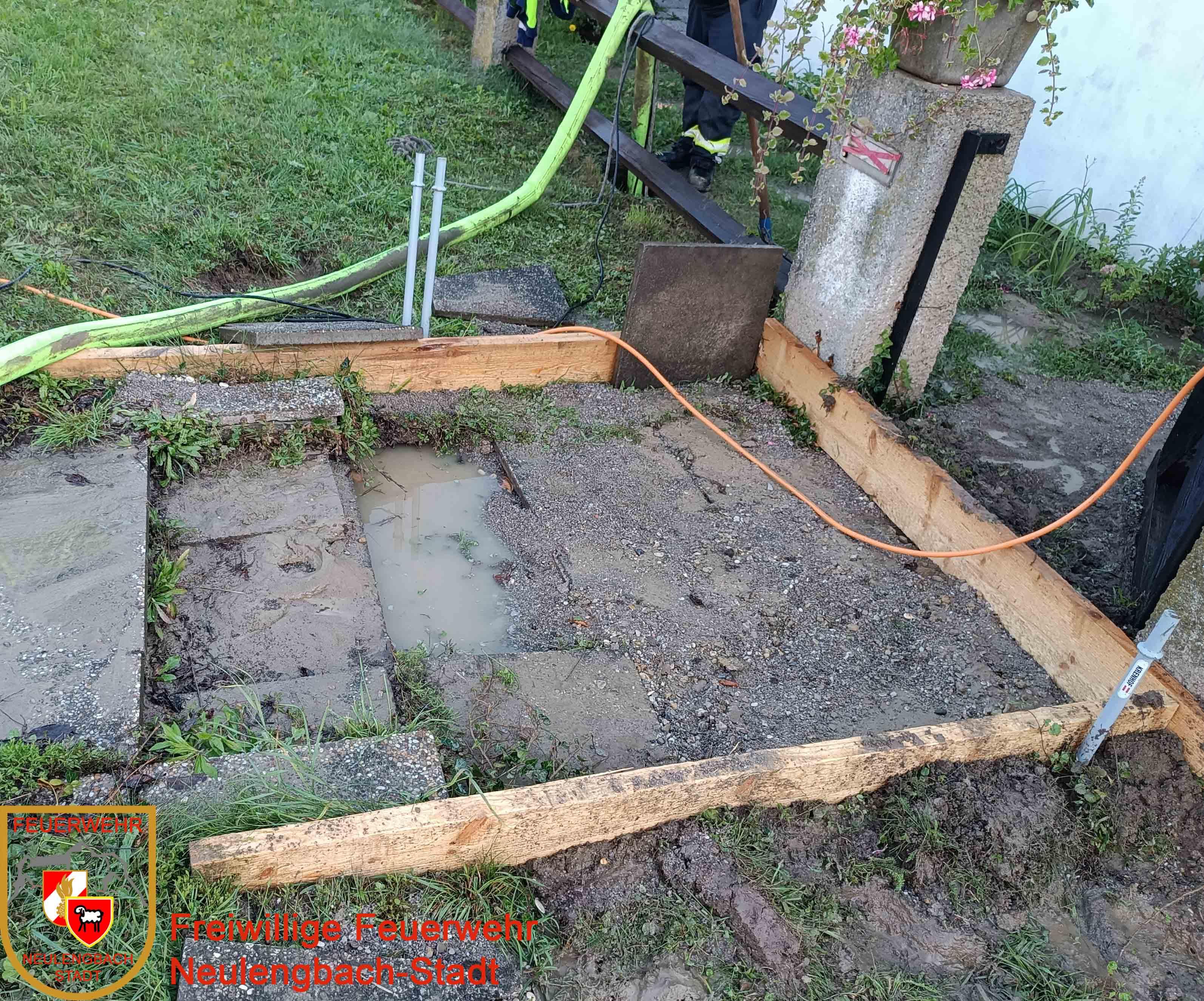 Weitere Einsatzkräfte rückten mit dem SRF und VF zur Einsatzstelle nach und übernahmen die Arbeiten im überfluteten Keller. Dort wurde mit mehreren Pumpen sowie einem Nasssauger der gesamte Kellerbereich so gut wie möglich trockengelegt.