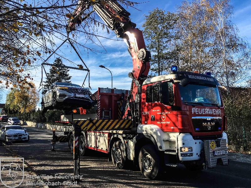 Einer der beiden beschädigten PKW konnte mit Hilfe von Rangierrollern aus dem Kreuzungsbereich entfernt und gesichert abgestellt werden, zur Bergung des anderen PKW war eine Kranarbeit notwendig. Der schwere SUV, der zwischen der Gartenhecke, einem im Garten befindlichen Baum und einer Wegweisertafel zum Stillstand gekommen war, wurde mit dem Ladekran des Wechselladefahrzeugs behutsam aus dem Garten gehoben und unweit der Unfallstelle gesichert abgestellt.