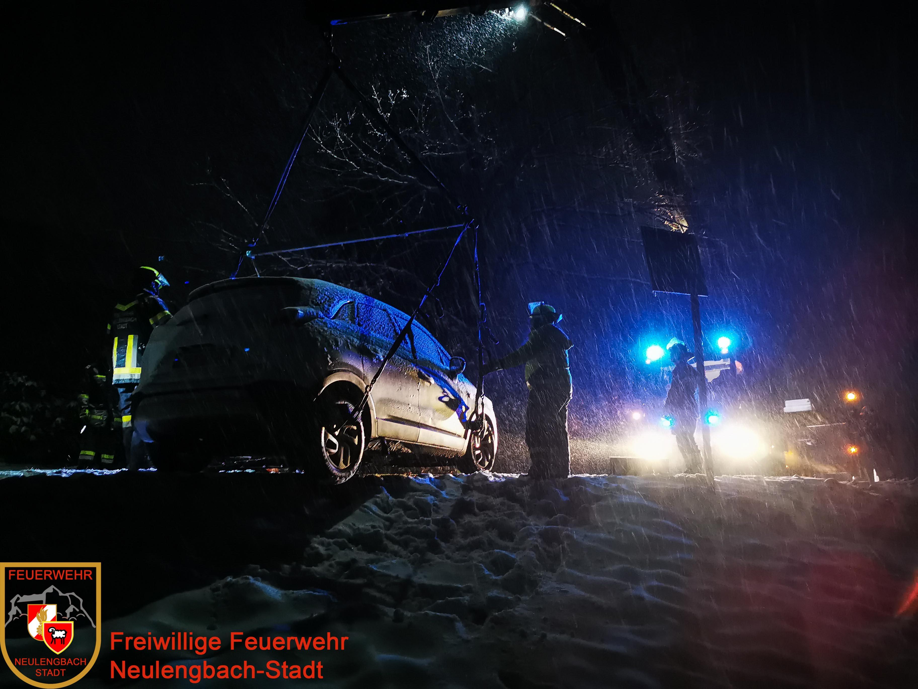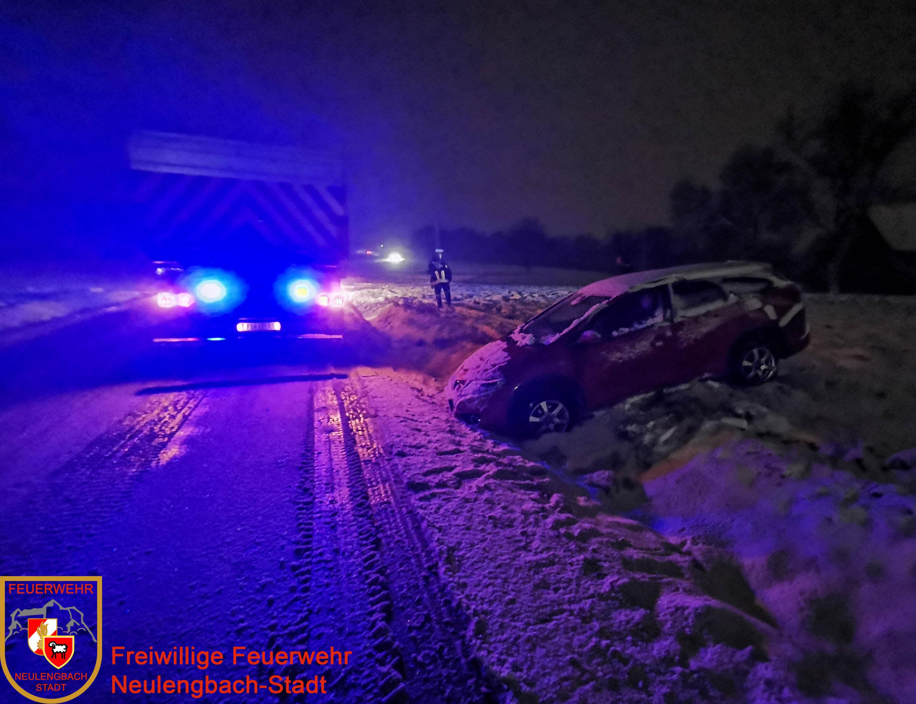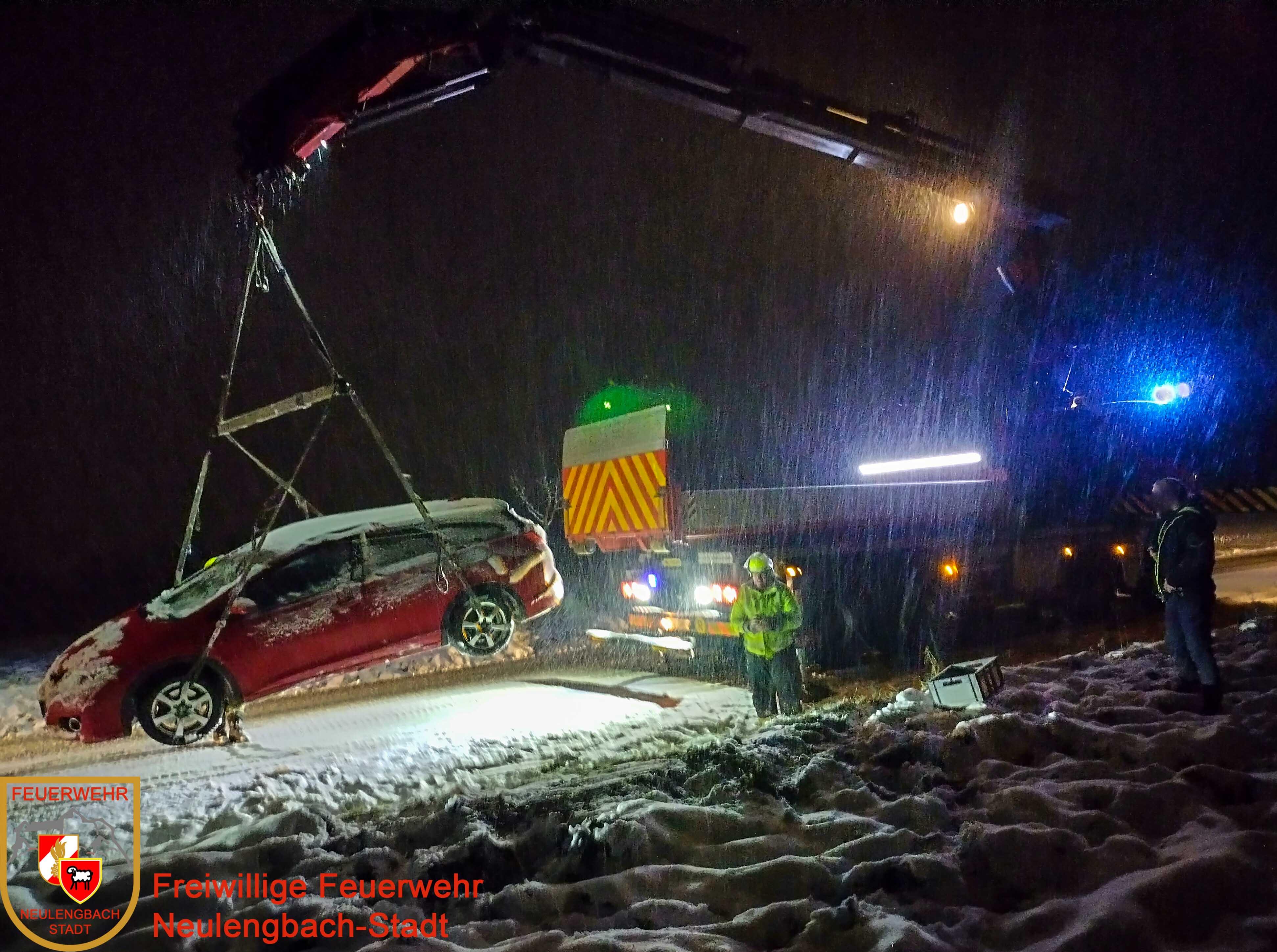 Um 18:50 Uhr wurde die Freiwillige Feuerwehr Neulengbach-Stadt über Funk zu einem Folgeeinsatz alarmiert. Ein Pkw kam auf der L129 von der Straße ab und blieb im Straßengraben hängen. Die Mannschaft hob mit dem Ladekran des Wechselladefahrzeugs das Auto zurück auf Straße, somit konnte der Lenker anschließend seine Fahrt fortsetzen.