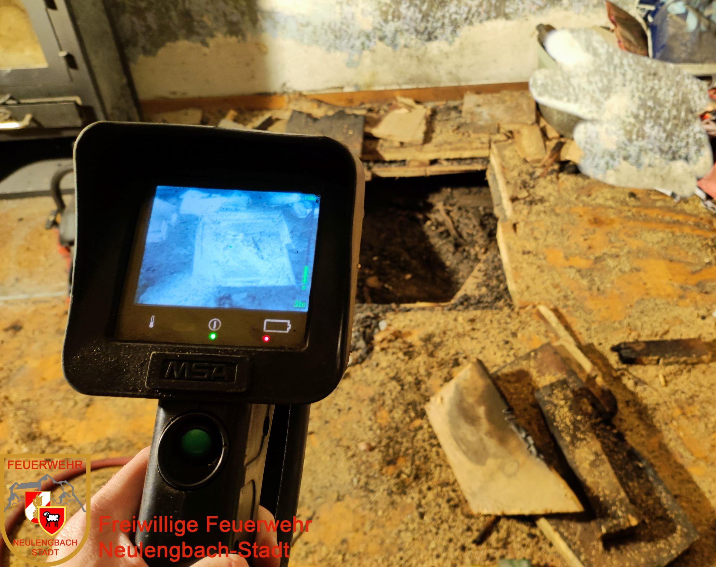Ein Druckbelüfter wurde zur Entrauchung des Hauses in Stellung gebracht. Die Erkundung des Trupps ergab, dass die Dielen des Holzbodens neben einem Ofen im ersten Stock glosten; heiße Asche in einem ungeeigneten Behälter befand sich im Bereich des Brandherdes. Diese wurde mit einem Stahlkübel weggetragen und die Glut mit der Kübelspritze abgelöscht. In der Folge wurden die Bretter mit einer Kettensäge ausgeschnitten, um zu möglichen darunter liegenden Glutnestern zu gelangen.