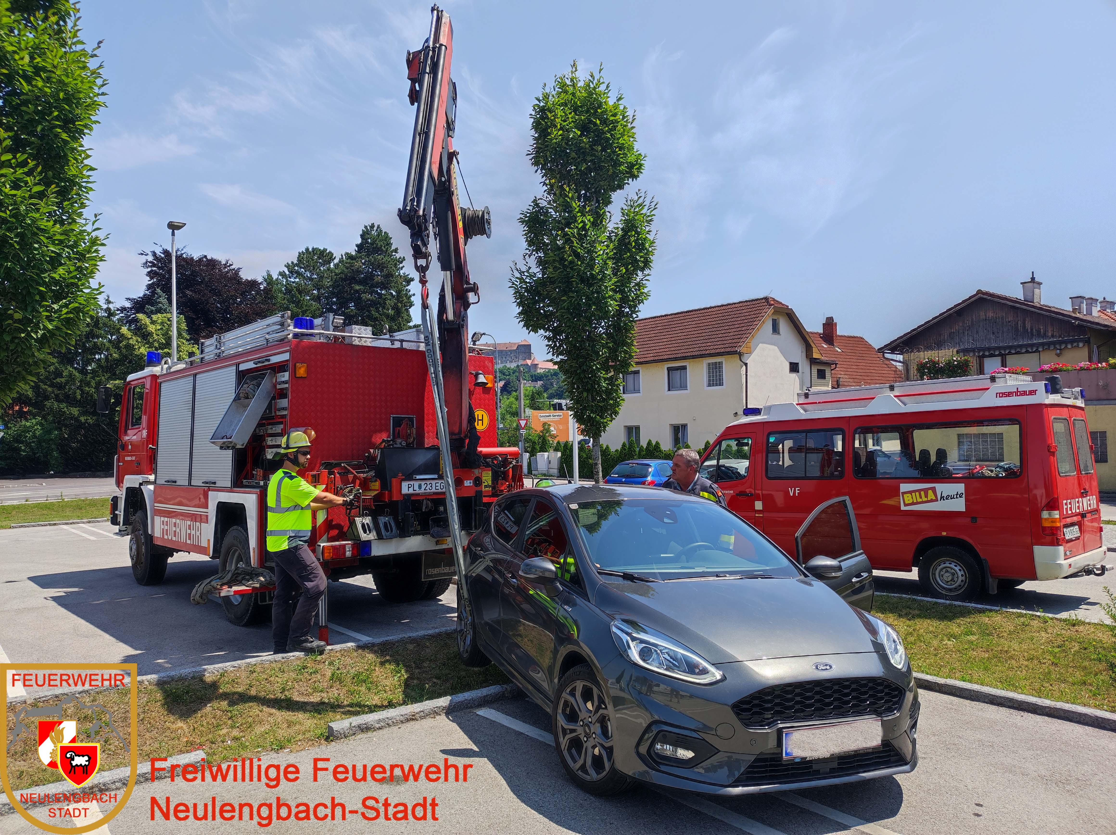 Am 30.06.2023 wurde die Freiwillige Feuerwehr Neulengbach-Stadt um 13:00 Uhr zu einer Pkw Bergung alarmiert. Auf einem Parkplatz machte sich eim abgestellter Pkw selbstständig, rollte über einen Hochbordstein und wurde erst von einem Baum gestoppt. Mit dem Ladekran des SRF konnte der Pkw behutsam wieder auf den Parkplatz gehoben werden.