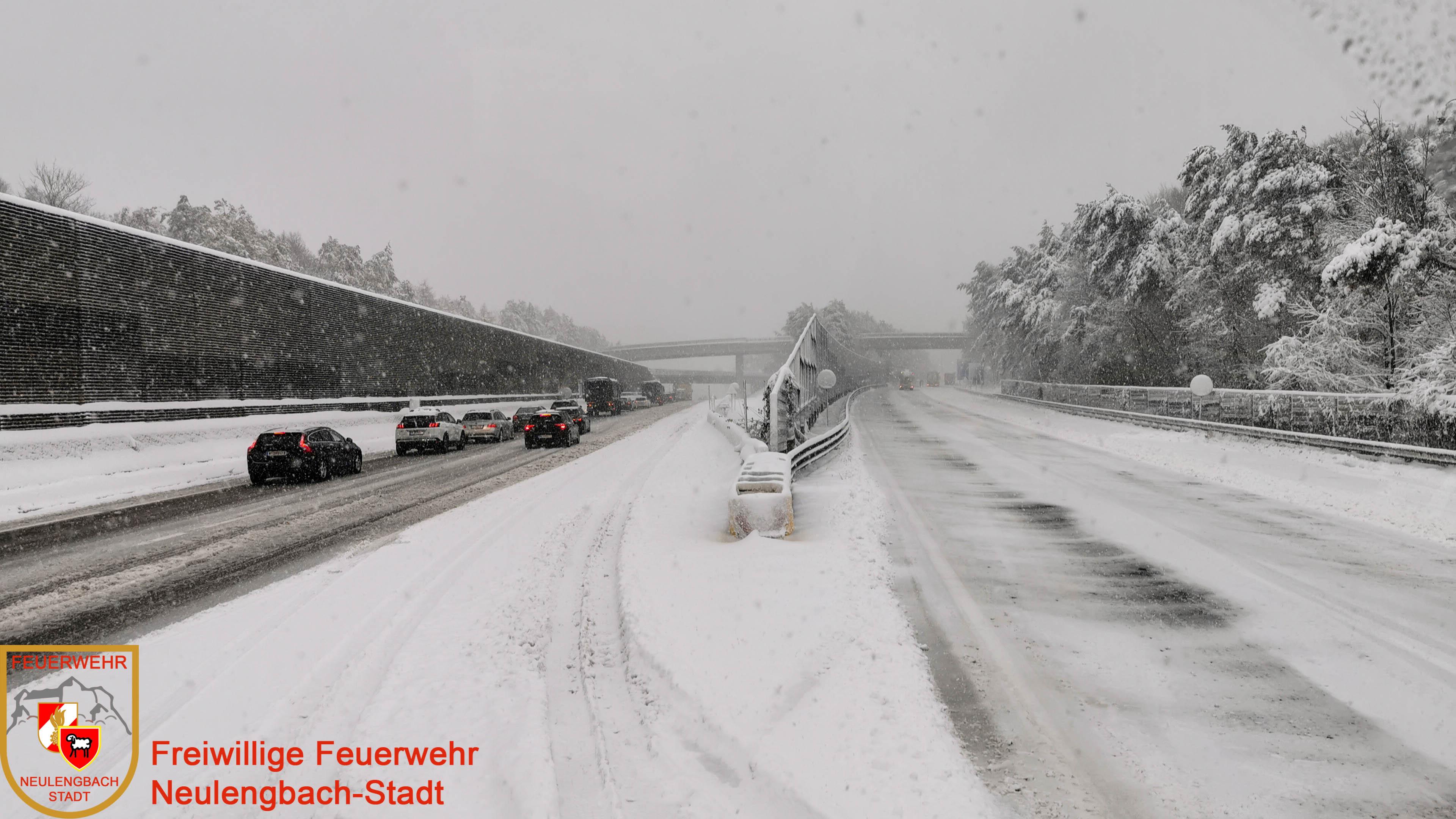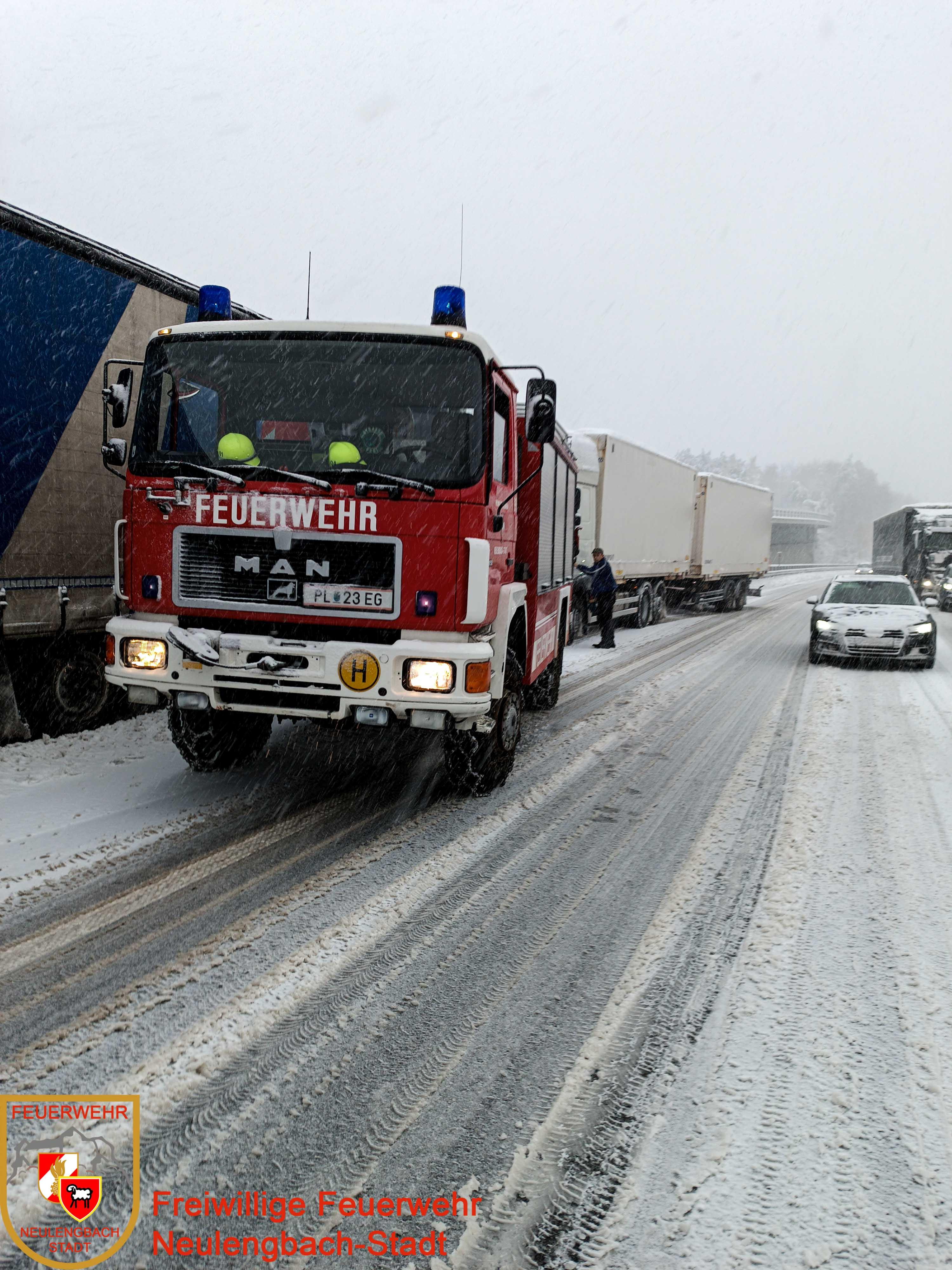 Da bereits einige Kameraden im Feuerwehrhaus anwesende waren, konnte sofort nach der Alarmierung das Schwer Rüstfahrzeug besetzt werden und bei dichtem Schneefall auf die Autobahn ausrücken.
