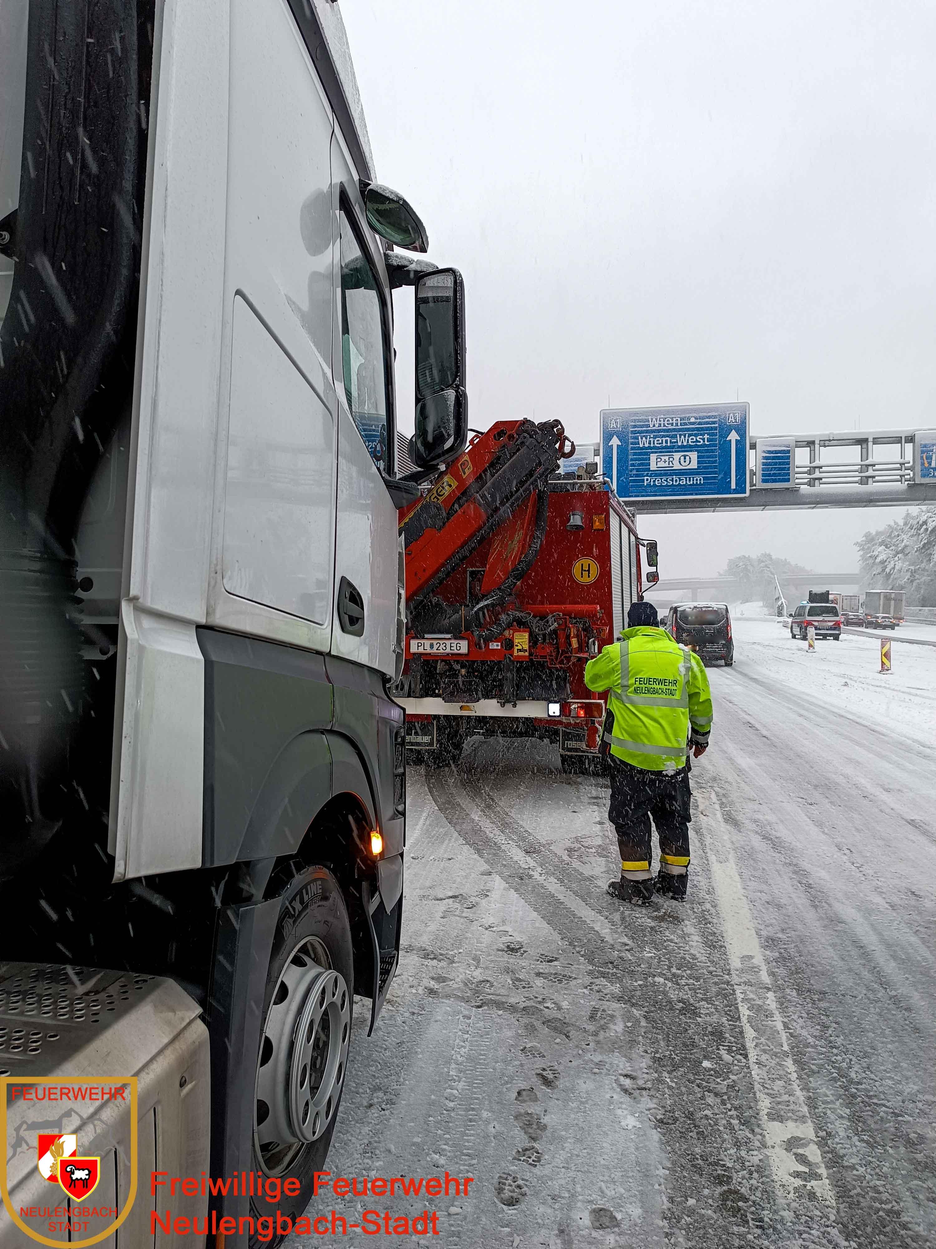 Auf der Steigungsstrecke zwischen dem Knoten Steinhäusl und der Ausfahrt Hochstraß begannen die Besatzung des SRF der Freiwilligen Feuerwehr Neulengbach-Stadt mit dem Abschleppen von im Schnee hängengebliebener LKW.