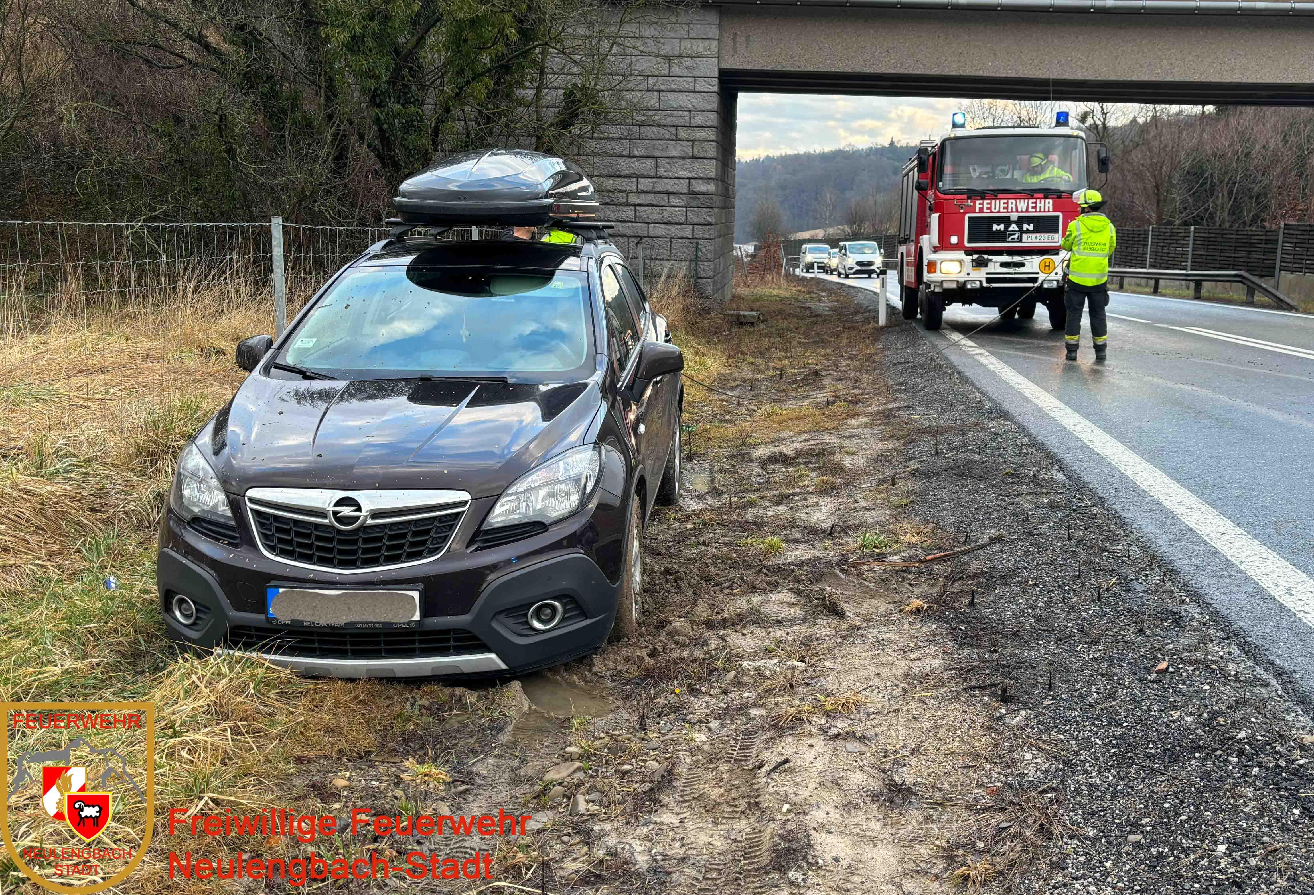 Um 16:12 Uhr folgte eine weitere Alarmierung. Am Autobahnzubringer St. Christophen kam ein PKW von der Fahrbahn ab und blieb stecken. Mit der Seilwinde des SRF wurde der PKW behutsam wieder auf die Fahrbahn gezogen. Um eine große Verschmutzung der Fahrbahn zu vermeiden wurden die Räder mit dem HLF gewaschen und die Fahrbahn gereinigt.