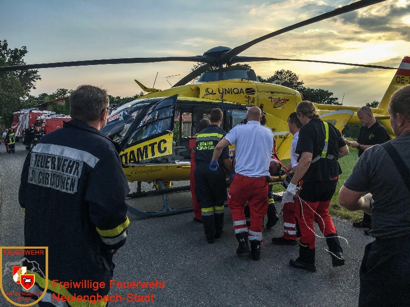 Beim Eintreffen am Einsatzort behandelten Rettungsdienst und Notarzt bereits den an der Wirbelsäule verletzten Patienten, der allerdings aus seiner Wohnung im ersten Stockwerk des Wohnhauses hinunter gebracht werden musste. In kameradschaftlicher Zusammenarbeit der Rettungskräfte und den Mannschaften der beiden Feuerwehren wurde ein Weg gefunden, um den auf einem Spineboard gebetteten Patienten über den Balkon, ein angrenzendes Zimmer und schließlich durch ein enges Stiegenhaus möglichst schonend ins Freie zu bringen. Wenige Minuten später traf der Rettungshubschrauber Christophorus 9 ein, dessen Crew den Patienten übernahm und den Transport ins Krankenhaus durchführte.