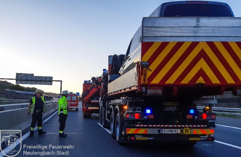 Nach einer Woche mit bereits sieben Einsätzen folgte am Sonntag, 1. Juni um 04:59 Uhr in der Früh eine weitere Alarmierung für die Freiwillige Feuerwehr Neulengbach-Stadt. Auf der Westautobahn (Autobahnkilometer 34,0; Fahrtrichtung Wien) war ein Kleinbus gegen die Betonleitelemente des Mittelstreifens geprallt und kam mit einem Schaden an der Vorderachse auf der zweiten Fahrspur zum Stillstand. Die Fahrzeugbergung erfolgte mit der absetzbaren Mulde und der elektrischen Seilwinde des Wechselladefahrzeugs.