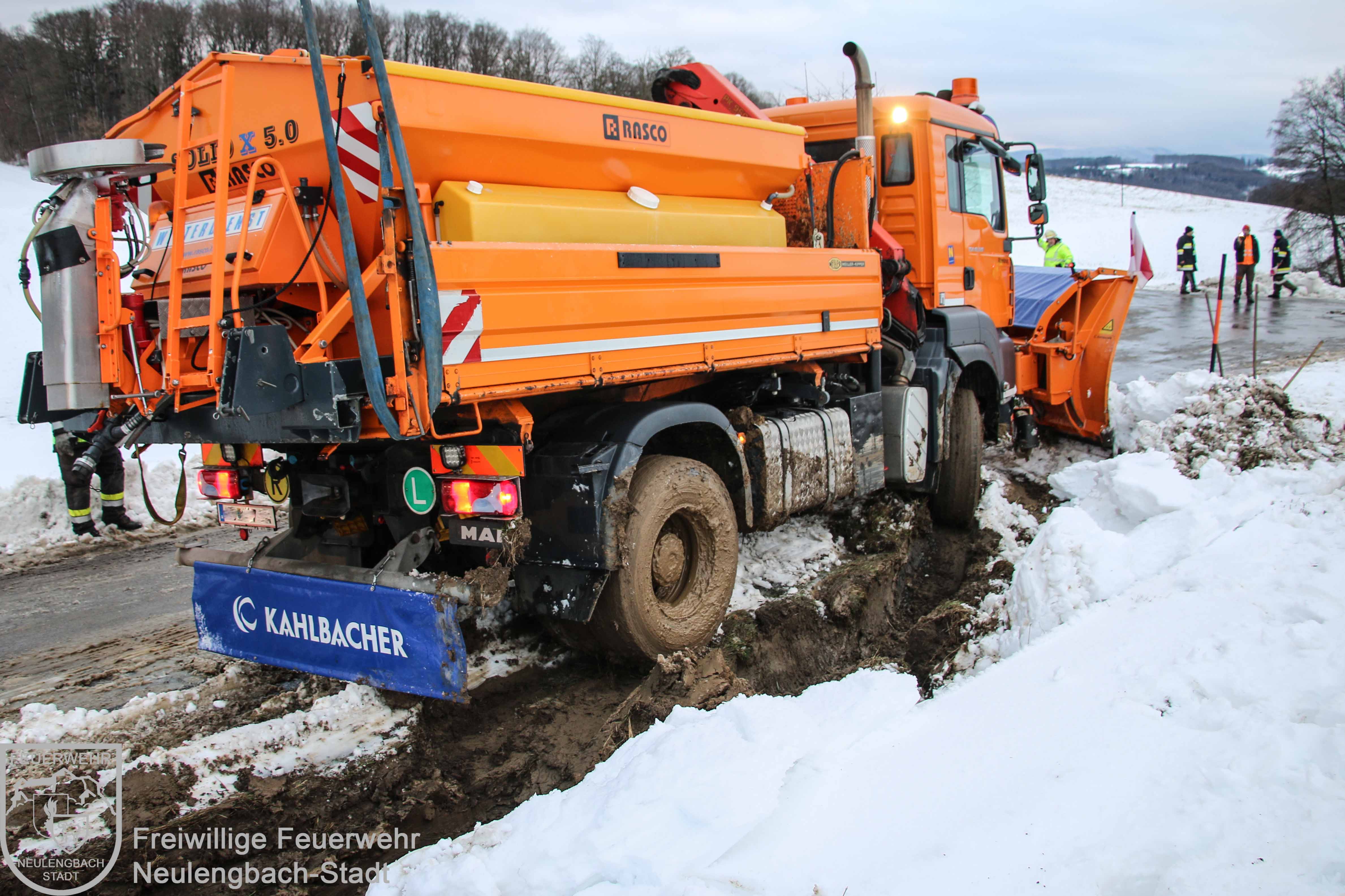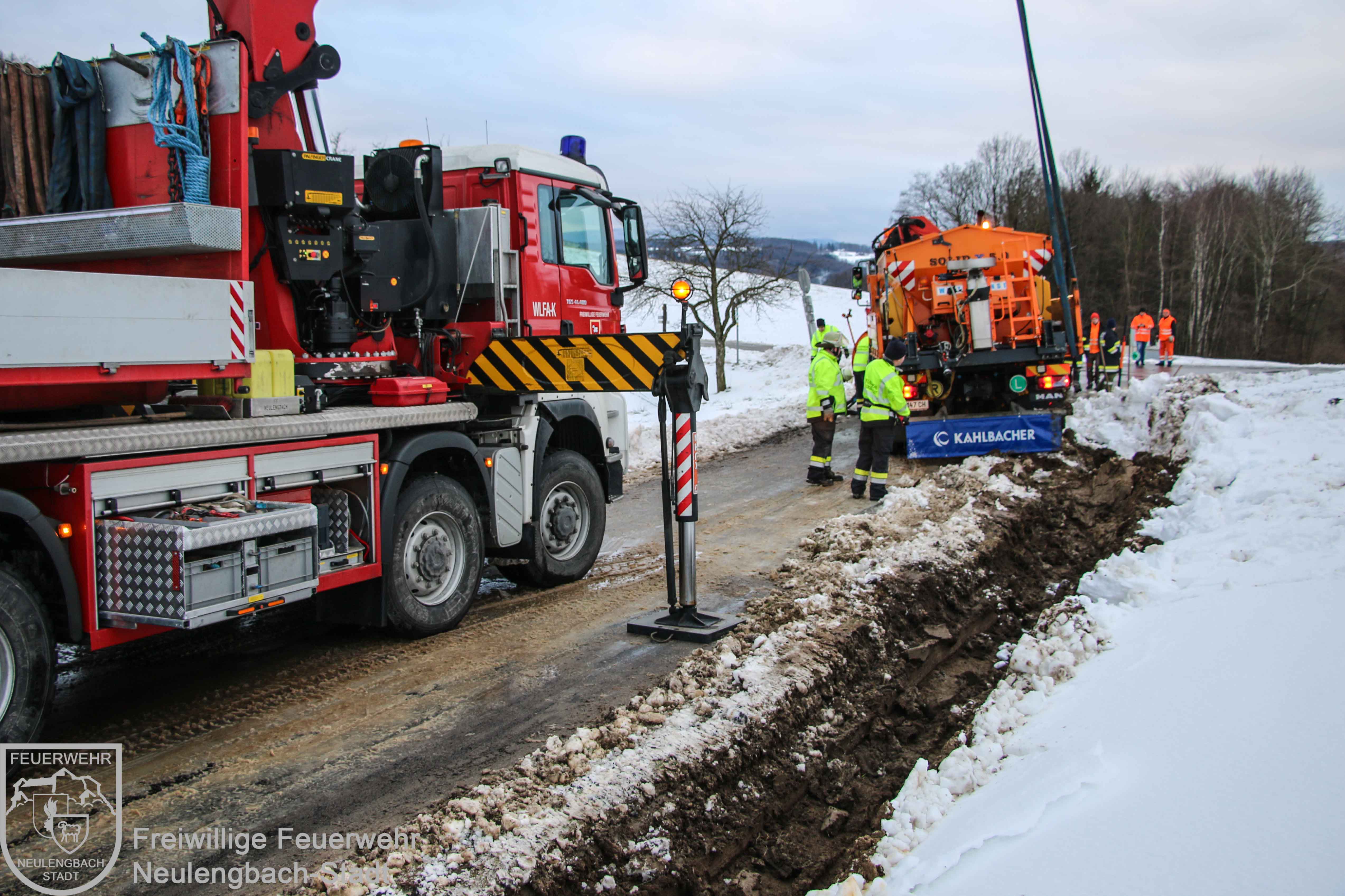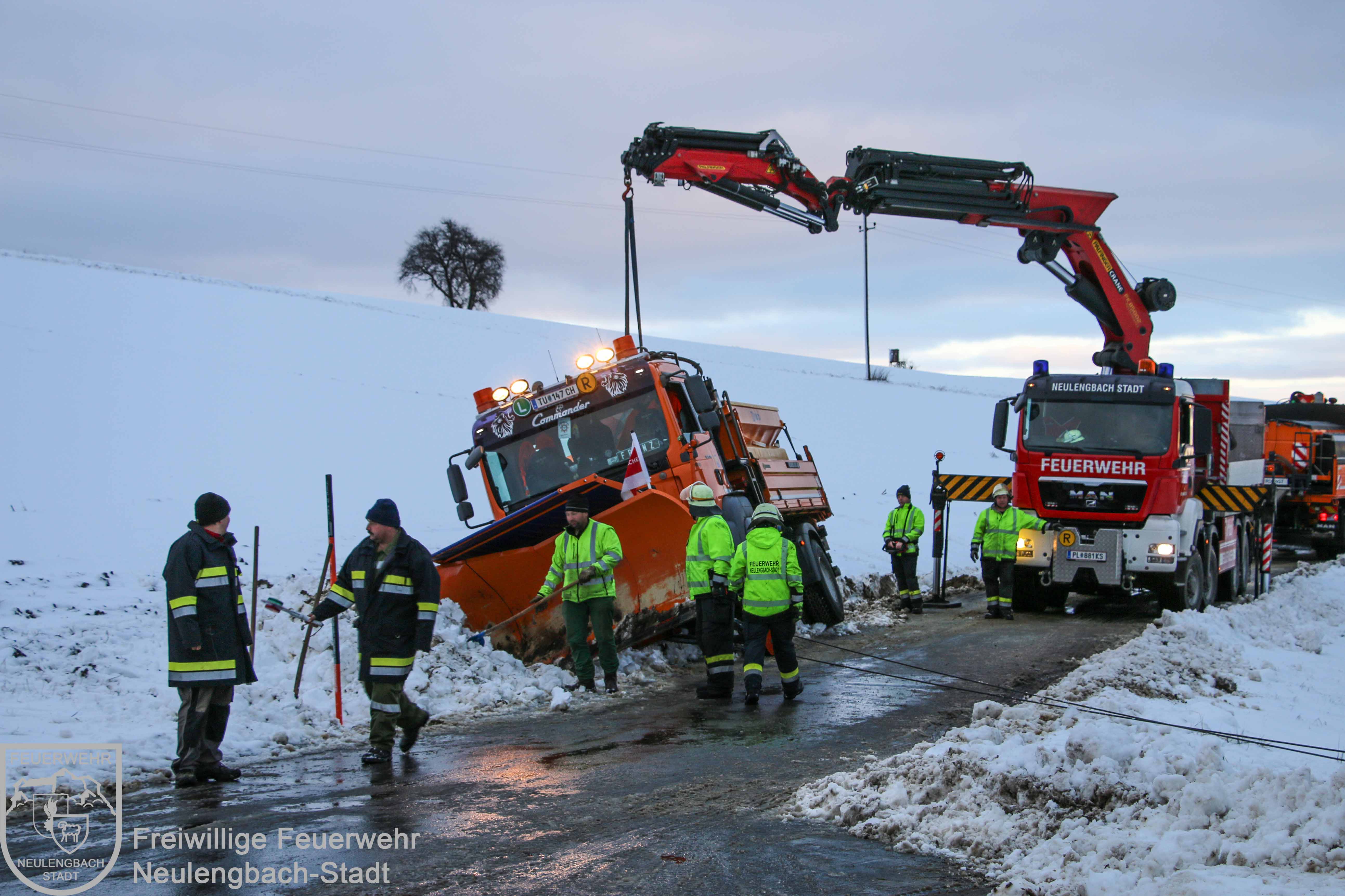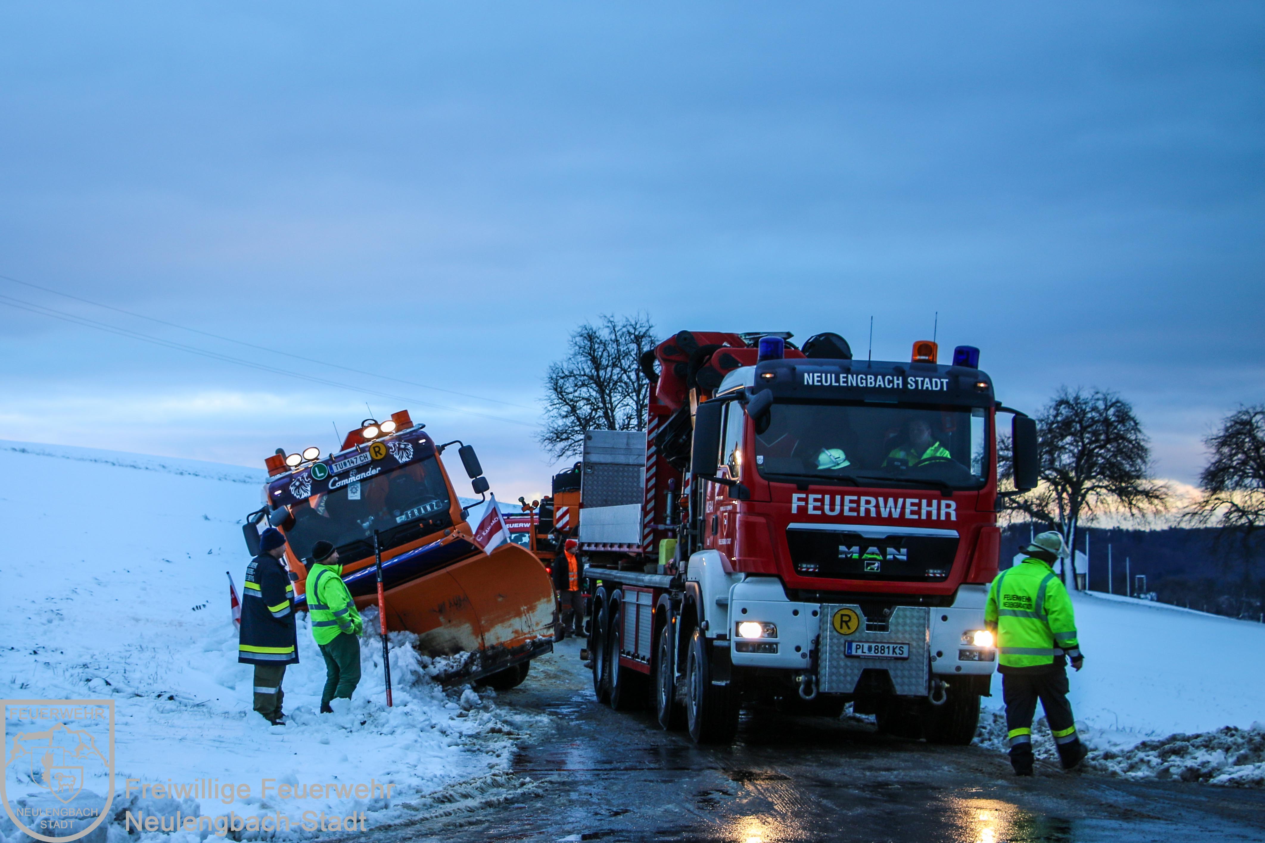 Am Dreikönigsfeiertag wurde um 07:31 Uhr die Freiwillige Feuerwehr Neulengbach-Stadt zur Unterstützung der Freiwilligen Feuerwehr Dornberg-Geigelberg alarmiert. Im Kreuzungsbereich Dornberger Straße / Wintenstraße war ein Räumfahrzeug des Winterdienstes in den Straßengraben geraten und dort im aufgeweichten Erdreich stecken geblieben. Mit der Seilwinde des Schweren Rüstfahrzeugs und einer beweglichen Scherrolle konnte der Schneepflug relativ rasch wieder aus seiner mißlichen Lage befreit werden, dabei wurde mit dem Kran des Wechselladefahrzeugs der Winterdienst-LKW am Heck gegen eine mögliche Kippgefahr gesichert.