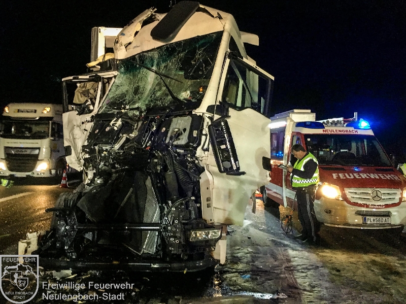 Angesichts des schwer deformierten Führerhauses der auf den anderen LKW aufgefahrenen Sattelzugmaschine kann von großem Glück gesprochen werden, dass die Insassen nach der Öffnung der Fahrertüre mit relativ leichten Verletzungen selbst aussteigen konnten.
