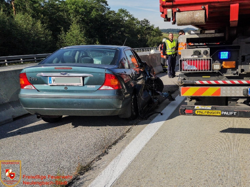 Am 23. September wurde die Freiwillige Feuerwehr Neulengbach-Stadt um 10:03 Uhr zu einem Einsatz auf der Westautobahn alarmiert. Bei Autobahnkilometer 40,5 (Fahrtrichtung Salzburg) war ein PKW mit einem LKW kollidiert und dann in einem nicht mehr fahrbereiten Zustand auf der Überholspur zu stehen gekommen. Die Bergung des Unfallfahrzeugs erfolgte mit dem Ladekran des Wechselladefahrzeugs, anschließend wurde der beschädigte PKW von der Autobahn abtransportiert und an geeigneter Stelle gesichert abgestellt.