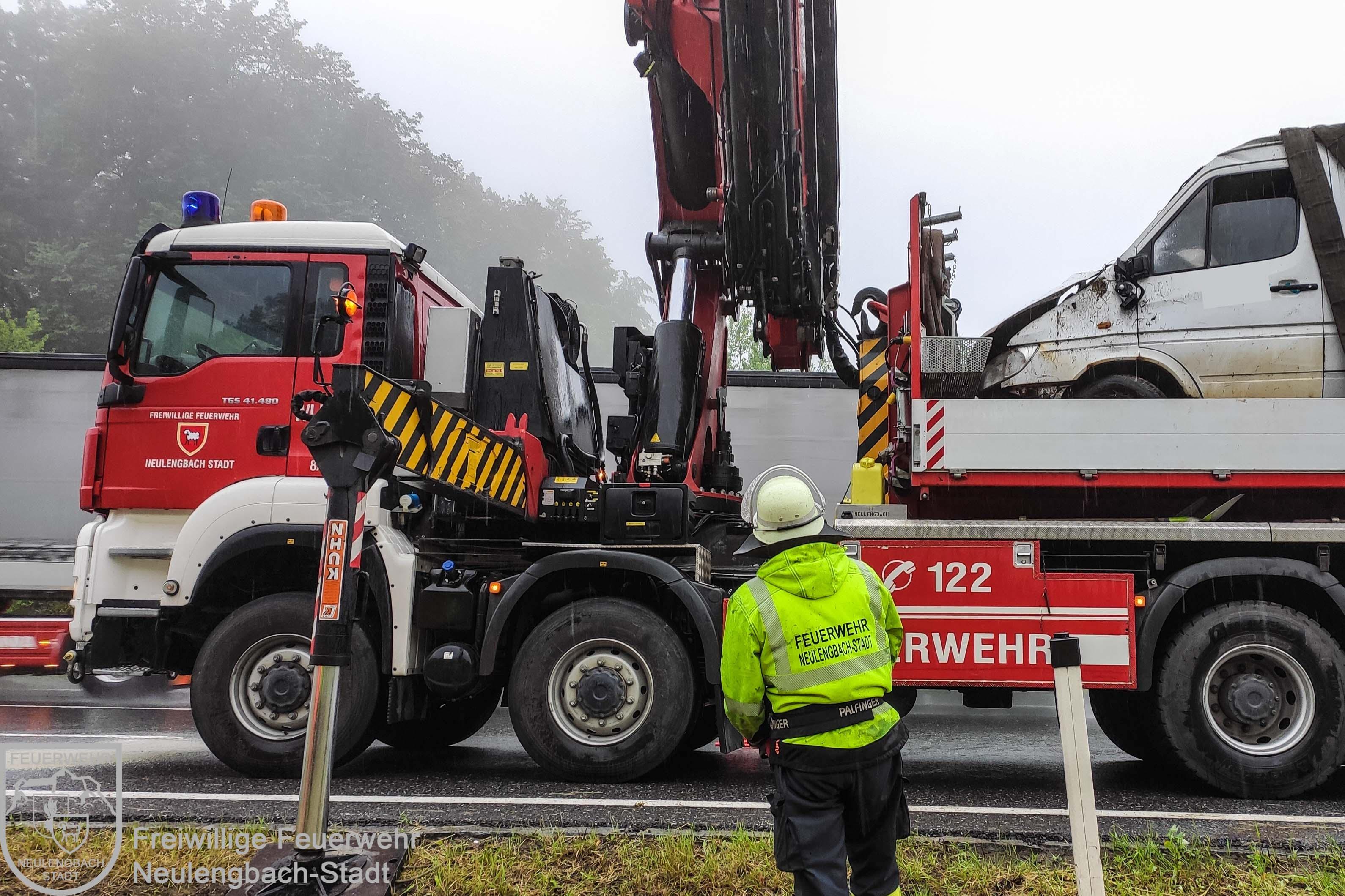 Mit Hilfe des Ladekrans unseres Wechselladefahrzeugs konnte der erheblich beschädigte Kleintransporter wieder auf die Räder gestellt und im Anschluß verladen und von der Autobahn abtransportiert werden.