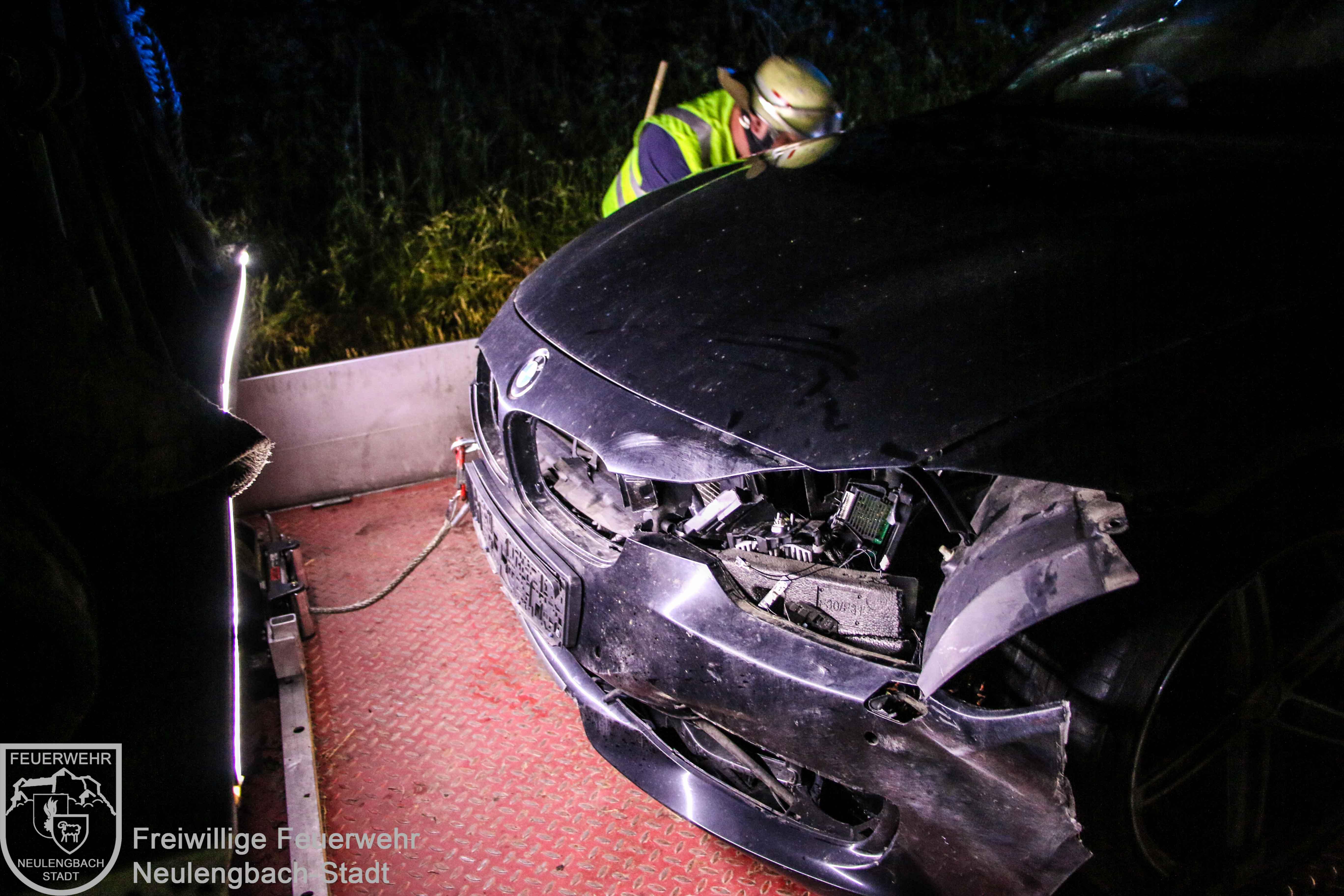 Der an der Front beschädigte PKW konnte mit der absetzbaren Abschleppmulde und der elektrischen Seilwinde geborgen und anschließend an geeigneter Stelle gesichert abgestellt werden.