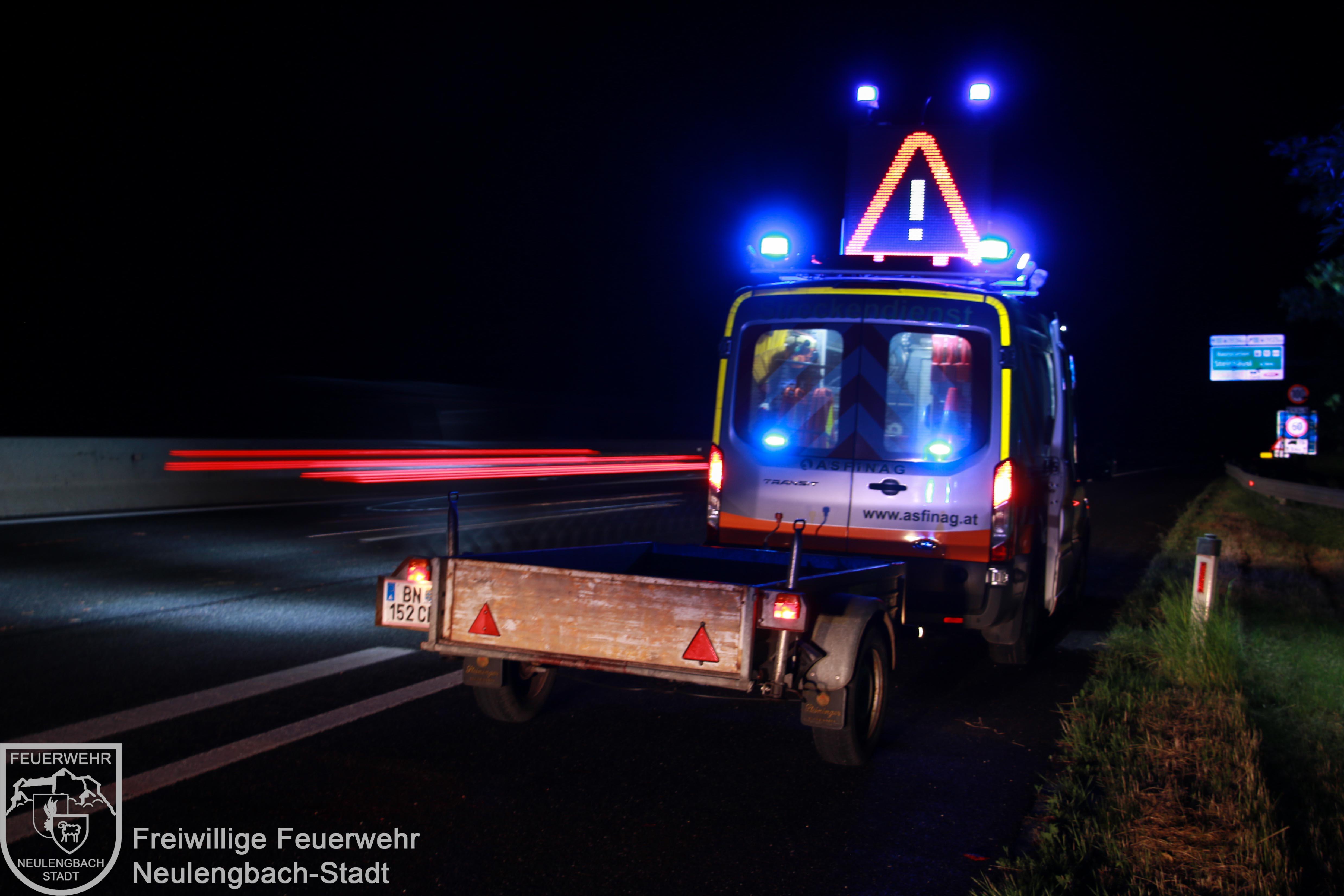 Am 14. Juni wurde die Freiwillige Feuerwehr Neulengbach-Stadt kurz vor Mitternacht zu einer Fahrzeugbergung auf der Autobahn alarmiert. Auf der Wiener Außenring Autobahn war zwischen Hochstraß und dem Knoten Steinhäusl ein PKW mit einem auf der Fahrbahn befindlichen Wildschwein kollidiert und nach dem Zusammenstoß in einem nicht mehr fahrbereiten Zustand zu stehen gekommen.