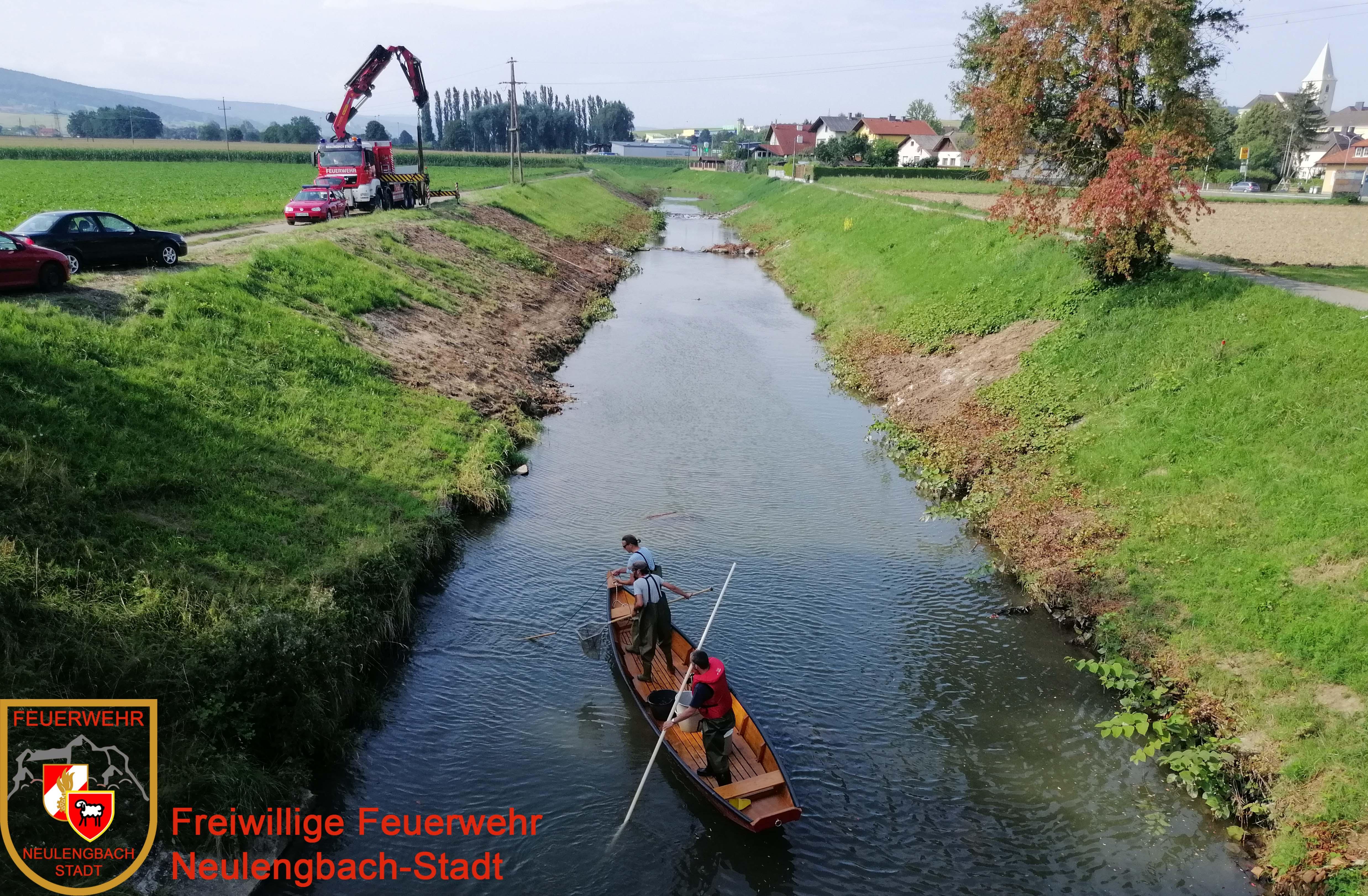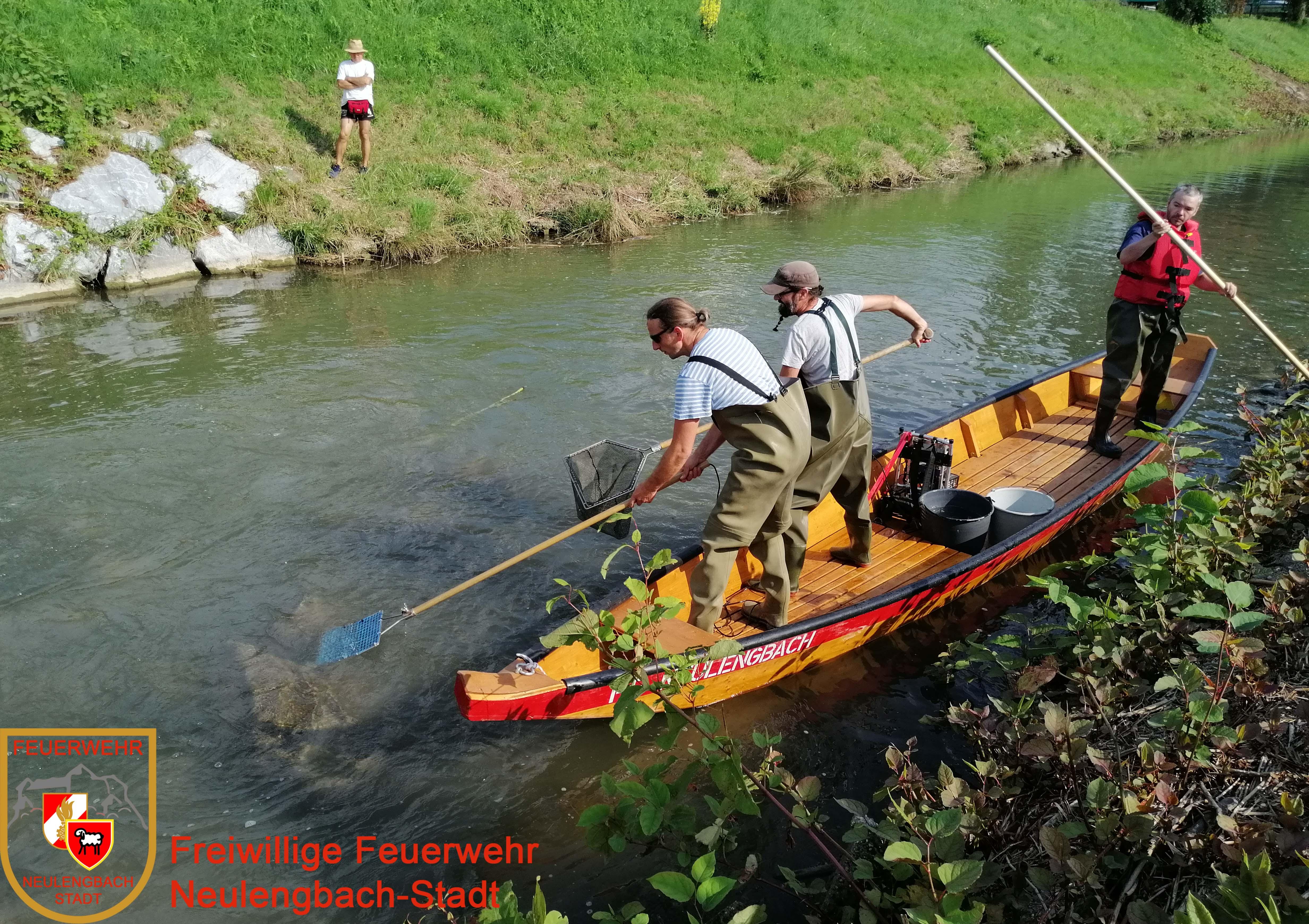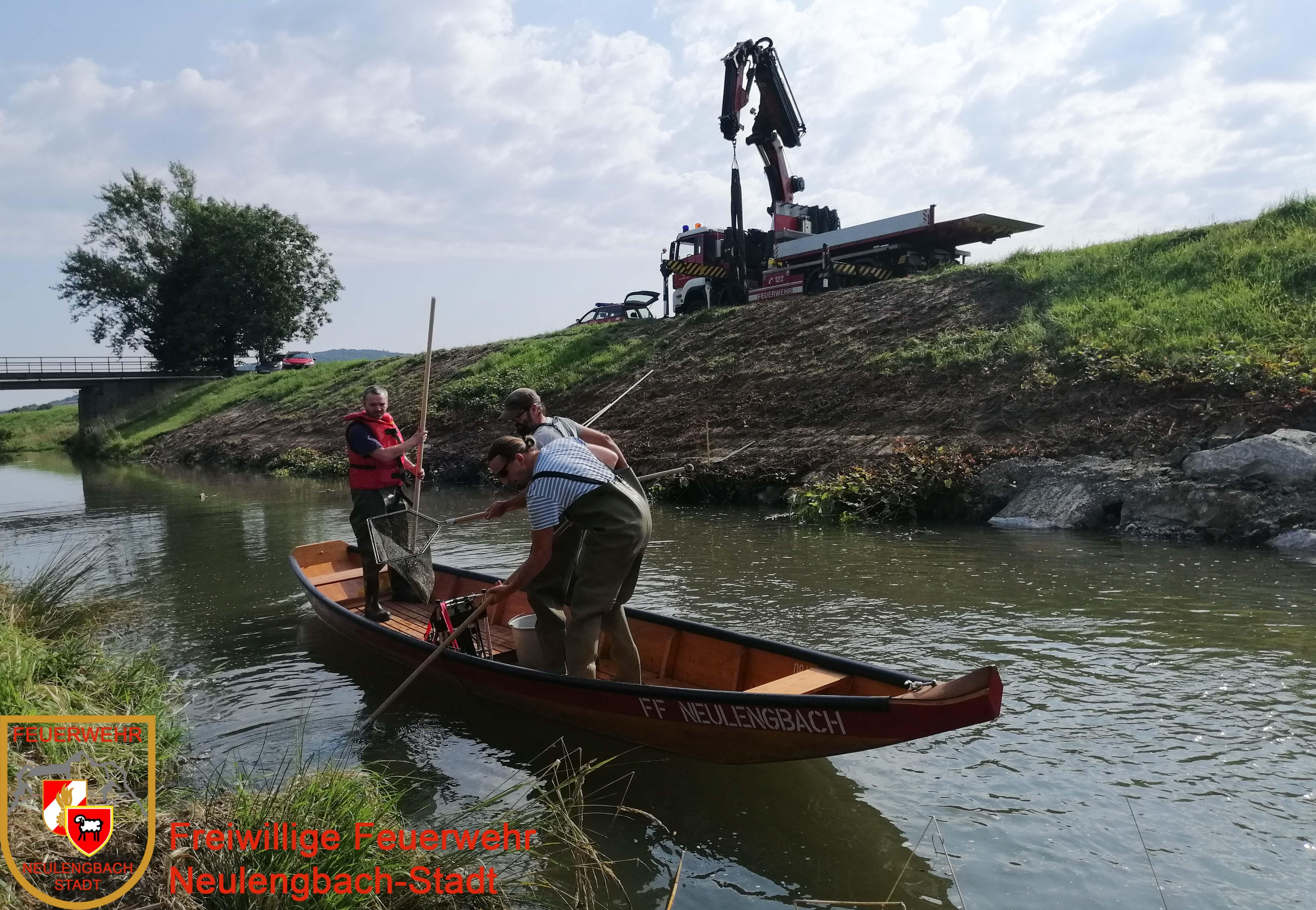 Am 14.08.2021 unterstützten wir den Fischereiausübungsberechtigten des Fischereireviers Große Tulln samt seinem Team. Da in den nächsten Wochen eine neue Fischaufstiegshilfe in einem Flussabschnitt bei Asperhofen gebaut wird, wurde in diesem Bereich der Fischbestand abgefischt. Die Freiwillige Feuerwehr Neulengbach-Stadt half bei diesen Arbeiten mit einer Feuerwehrzille samt Besatzung, da ein anderes Arbeiten bei dieser Wassertiefe nicht durchführbar war. Das Wasserfahrzeug wurde mit dem Kran des Wechselfahrzeuges in die Große Tulln gehoben, da keine andere Möglichkeit bestand es zu Wasser zulassen.