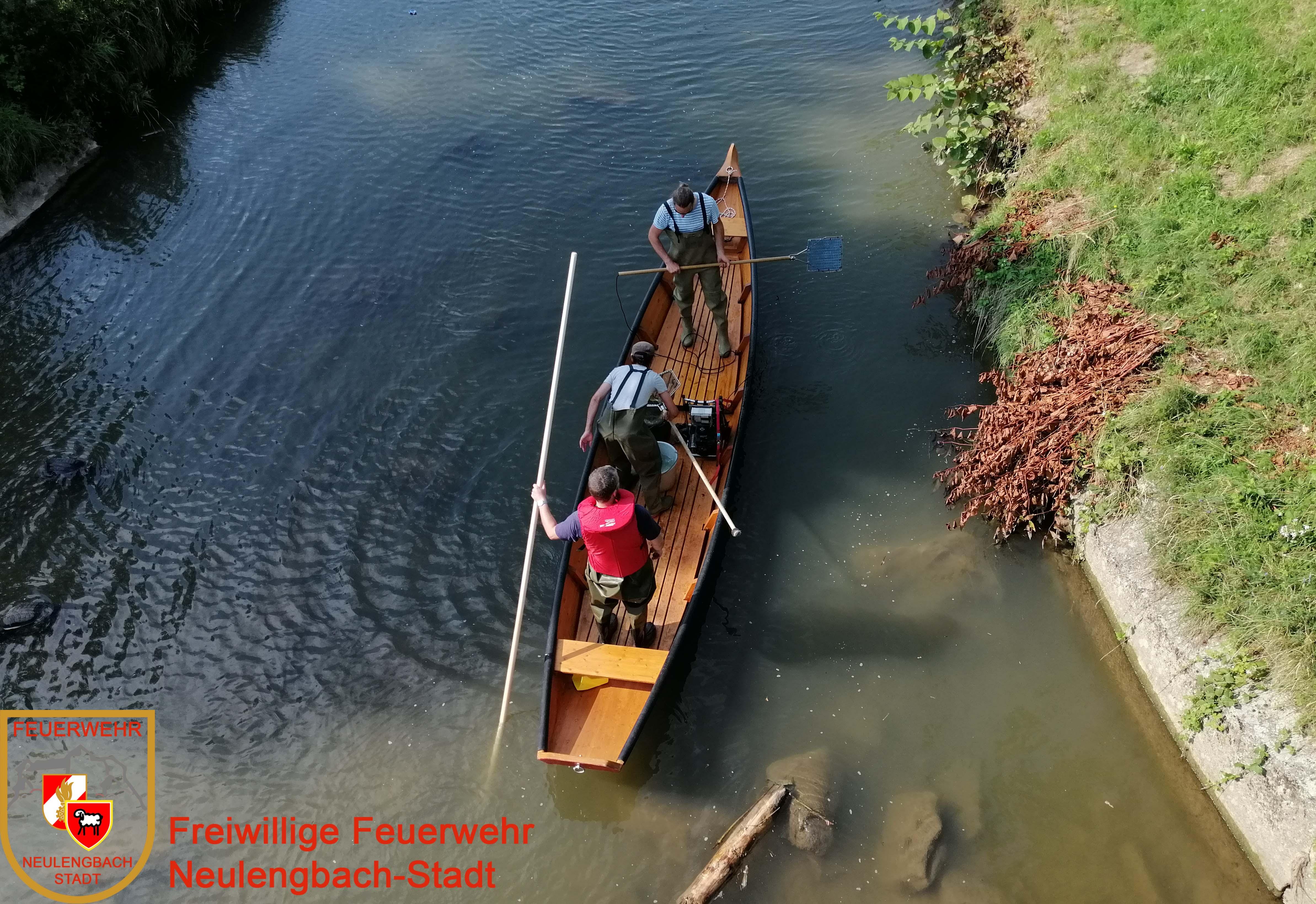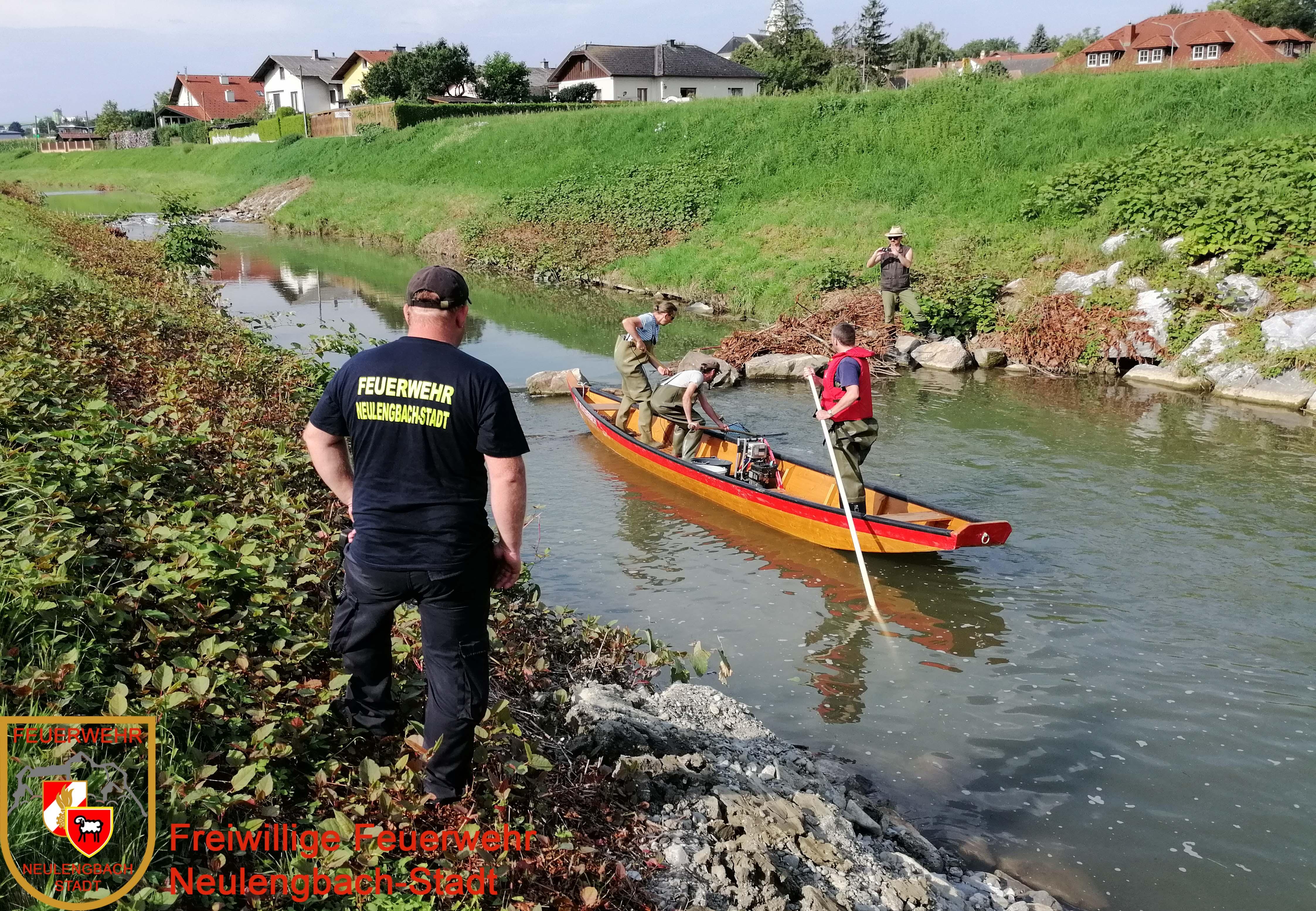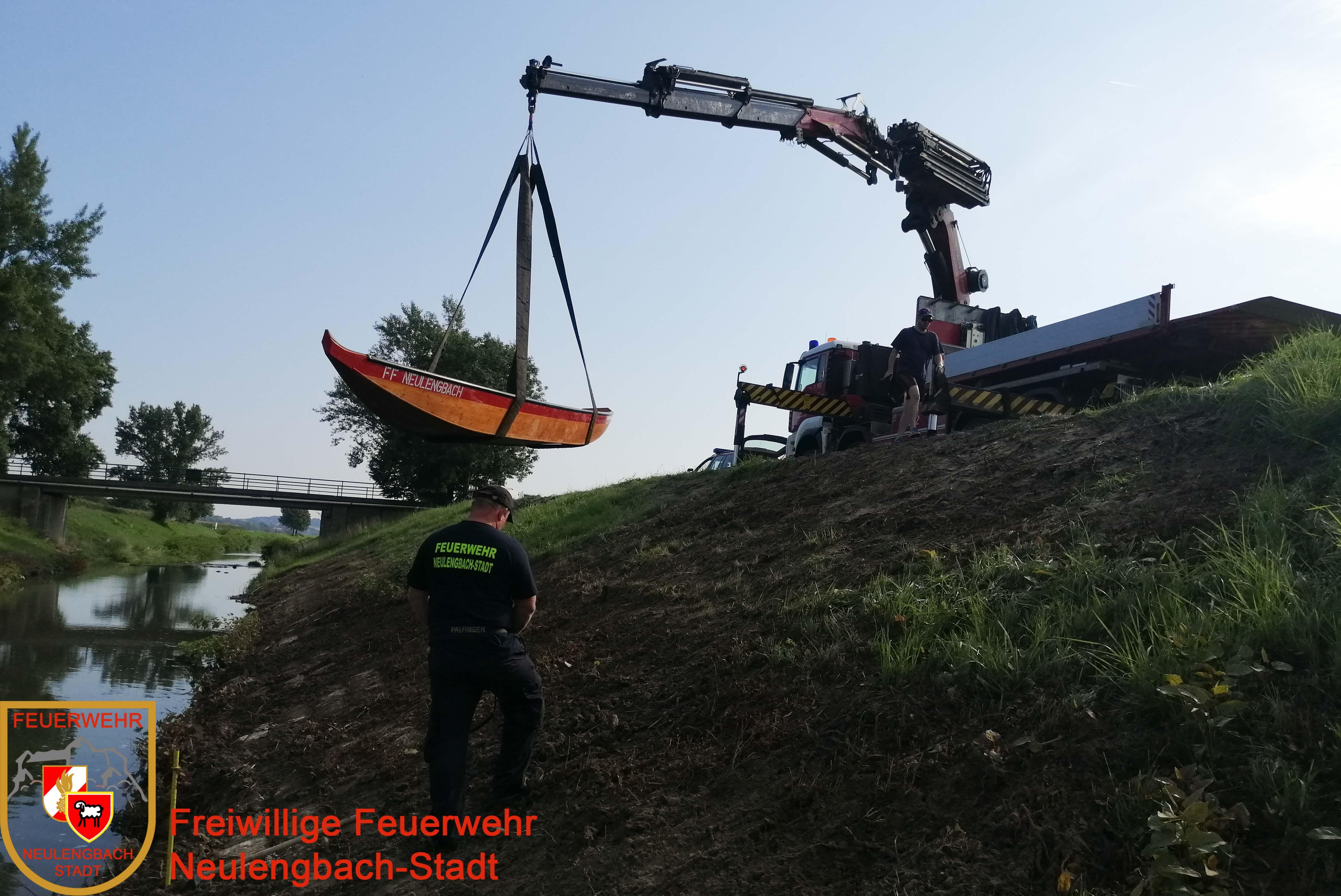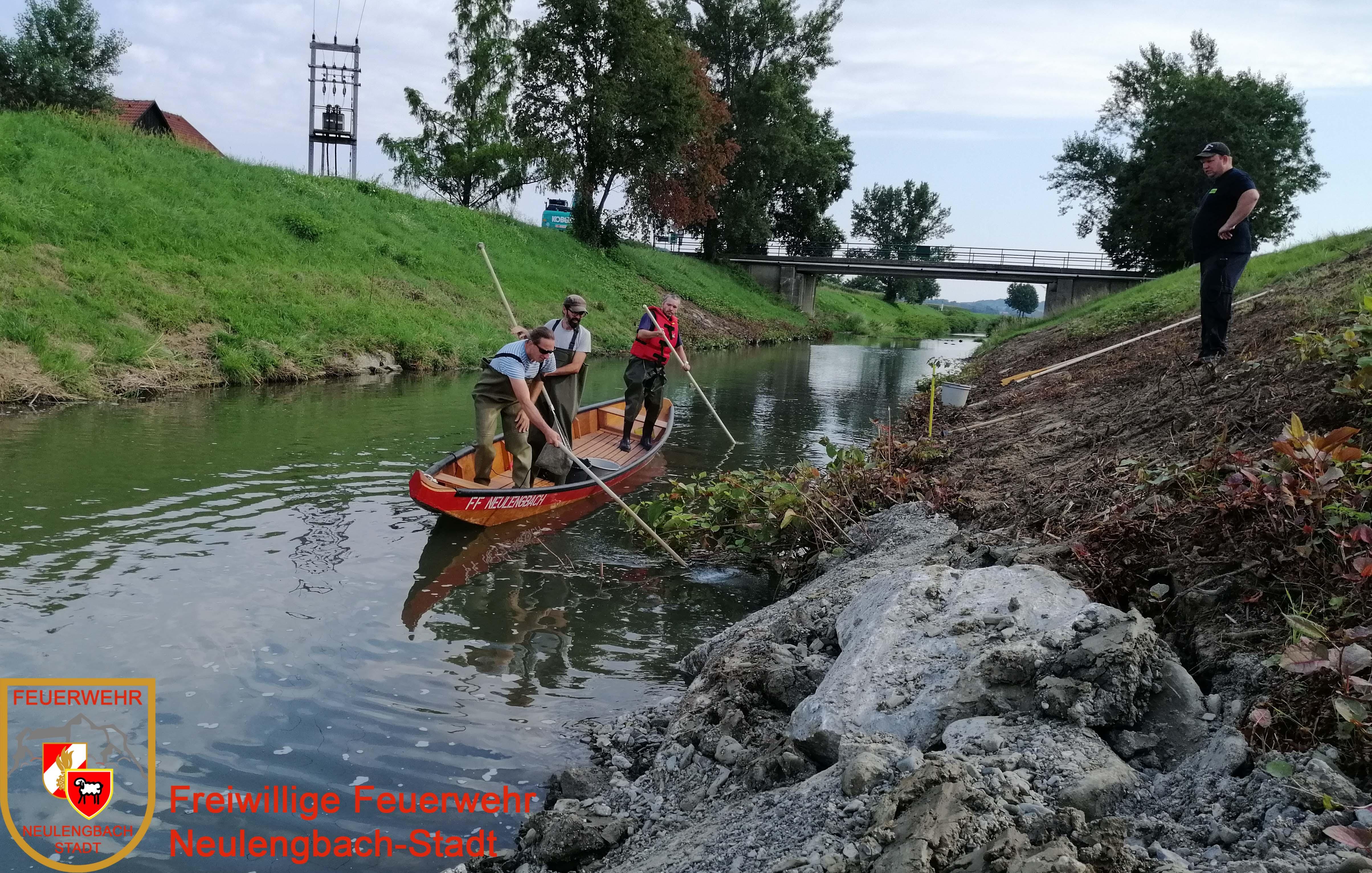 Am 14.08.2021 unterstützten wir den Fischereiausübungsberechtigten des Fischereireviers Große Tulln samt seinem Team. Da in den nächsten Wochen eine neue Fischaufstiegshilfe in einem Flussabschnitt bei Asperhofen gebaut wird, wurde in diesem Bereich der Fischbestand abgefischt. Die Freiwillige Feuerwehr Neulengbach-Stadt half bei diesen Arbeiten mit einer Feuerwehrzille samt Besatzung, da ein anderes Arbeiten bei dieser Wassertiefe nicht durchführbar war. Das Wasserfahrzeug wurde mit dem Kran des Wechselfahrzeuges in die Große Tulln gehoben, da keine andere Möglichkeit bestand es zu Wasser zulassen.