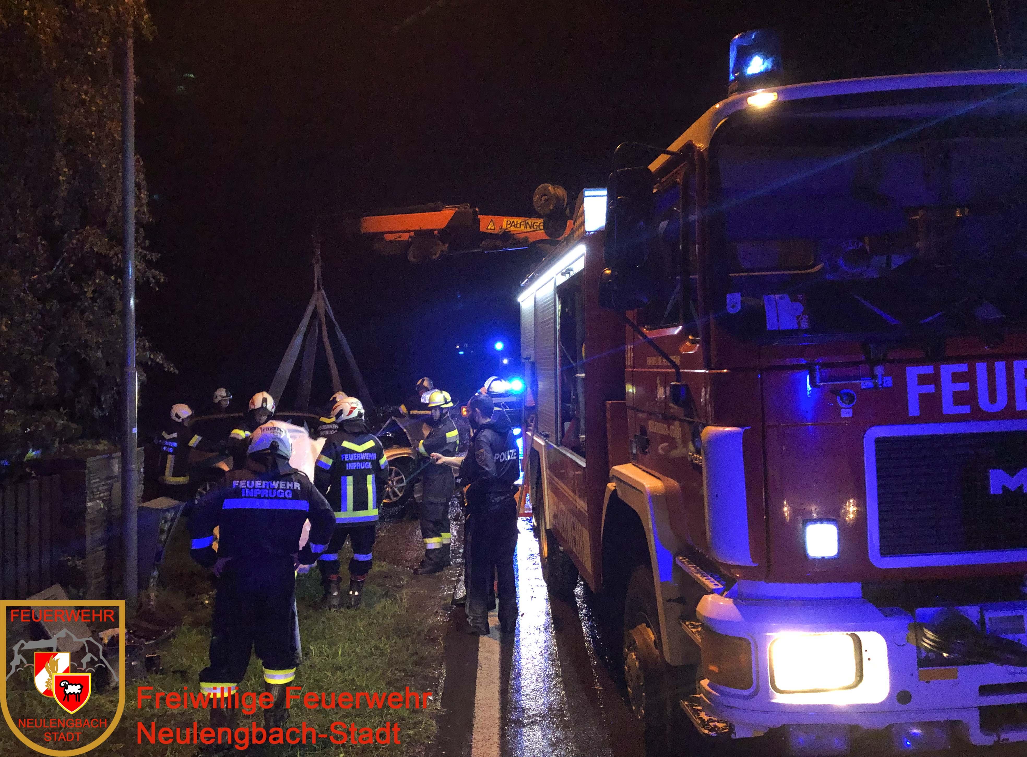 Nur wenige Sekunden nach der Alarmierung auf die Autobahn wurden wir zu einer weiteren Fahrzeugbergung auf die B 19 nach Inprugg alarmiert. Die Freiwillige Feuerwehr Inprugg benötigte einen Ladekran um die Bergung durchzuführen. Dies übernahm unser Schwerrüstfahrzeug; als unsere Mannschaft am Unfallort ankam war der Lenker bereits am Weg ins Krankenhaus, die Polizei und die Kameraden der Feuerwehr Inprugg hatten bereits sämtliche Absicherungsmaßnahmen getroffen. Mit vereinten Kräften wurden die Anschlagmittel am Pkw angebracht und mit dem Ladekran des SRF das Fahrzeug zur Seite gehoben.
