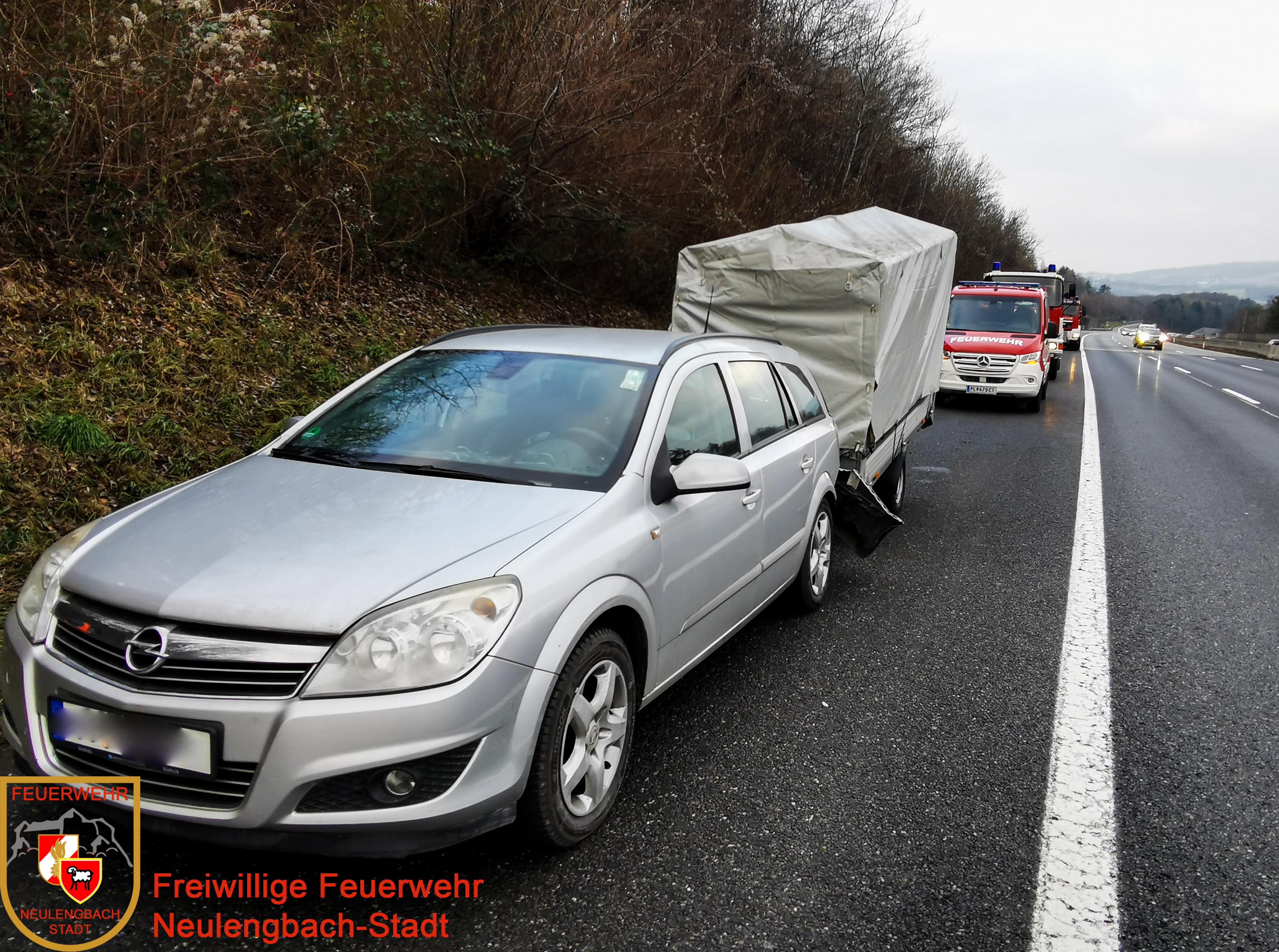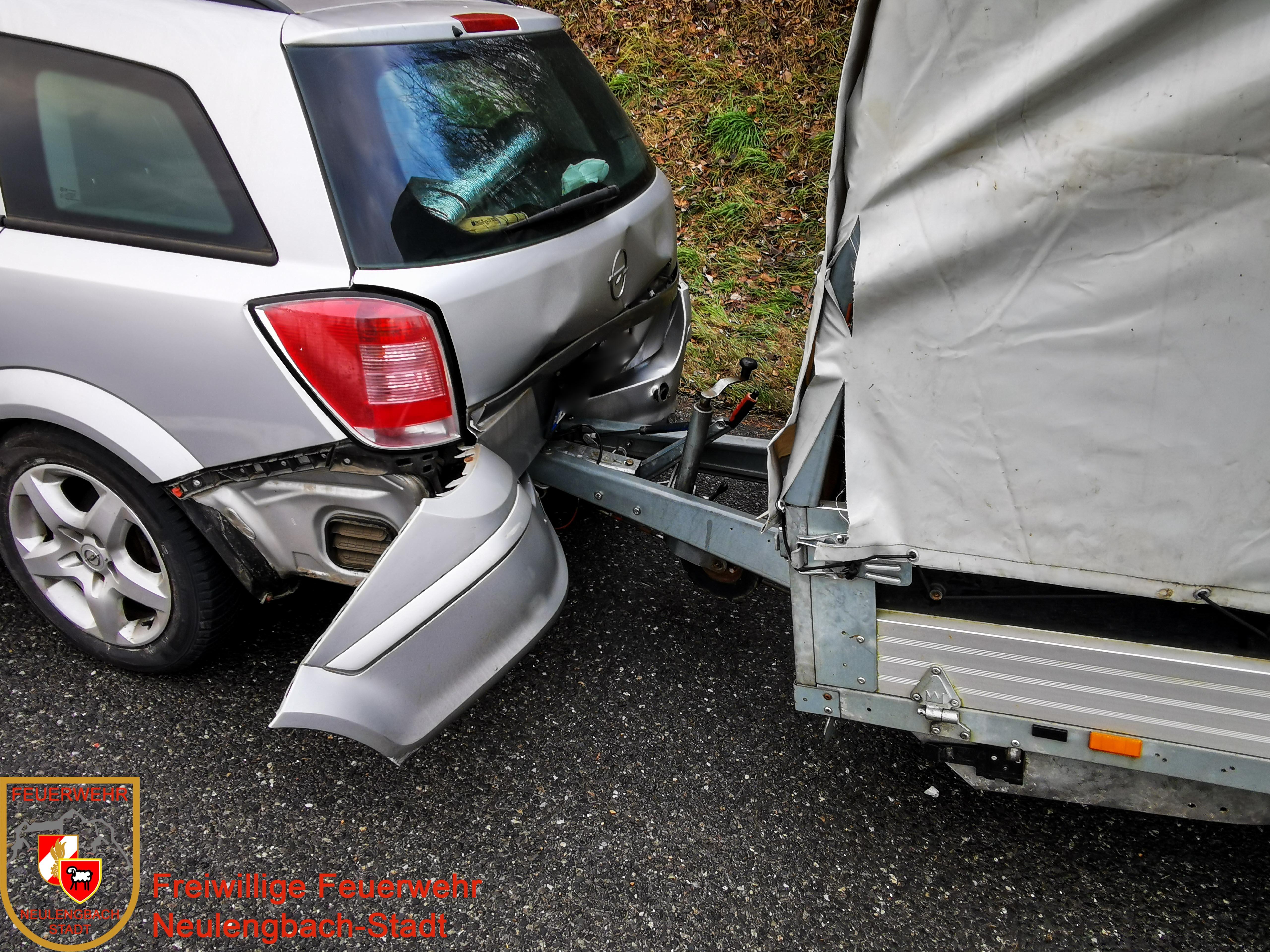 Ein PKW war auf einen anderen PKW mit Anhänger aufgefahren. Ein Fahrzeug war noch fahrbereit und konnte per Achse auf einem geeigneten Ort gesichert abgestellt werden, das zweite wurde auf das Plateau des Wechselladefahrzeugs verladen und ebenfalls gesichert abgestellt.