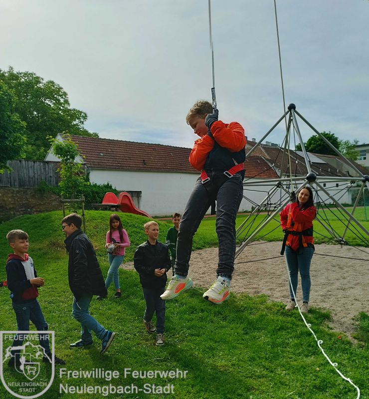 Geschicklichkeit und Schnelligkeit waren beim Parcours und Tic-Tac-Toe gefragt. Beim Knotenbinden zeigten die Kinder, was sie im Feuerwehrdienst schon gelernt hatten. Ein Rettungsauto konnte genau unter die Lupe genommen werden, ebenso wie die Einsatzbekleidung, die auch ausprobiert wurde. Die Notrufnummern wurden wiederholt und das richtige Absetzen eines Notrufs geübt. Mit dem hydraulischen Rettungsgerät und Hebekissen wurde das Gleichgewicht getestet. Zwischendurch blieb auch Zeit zum Fangen spielen und für den Austausch der Betreuer:innen. Zum Abschluss gab es für jedes Kind ein Goodybag und für jede Gruppe eine Urkunde.