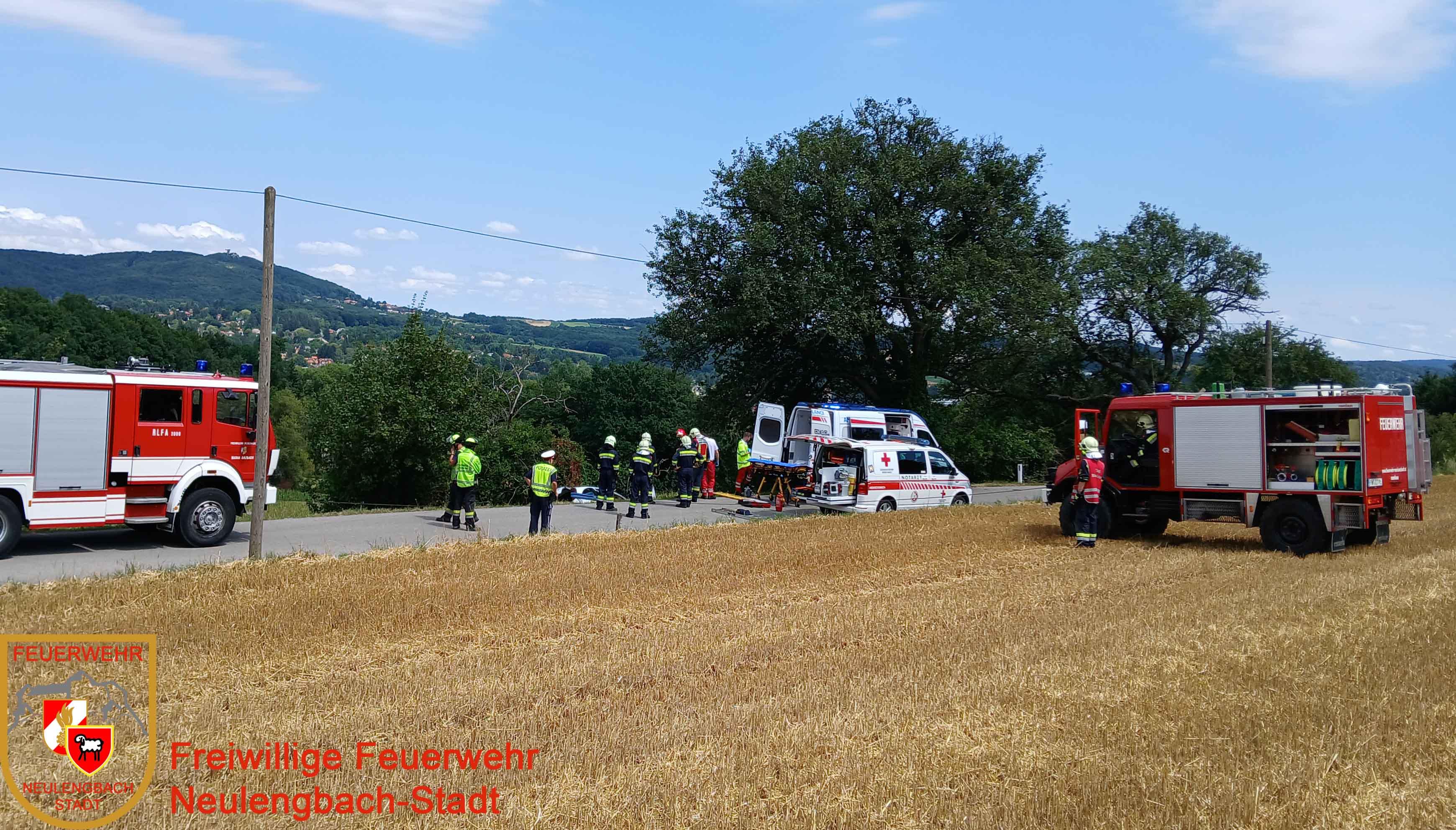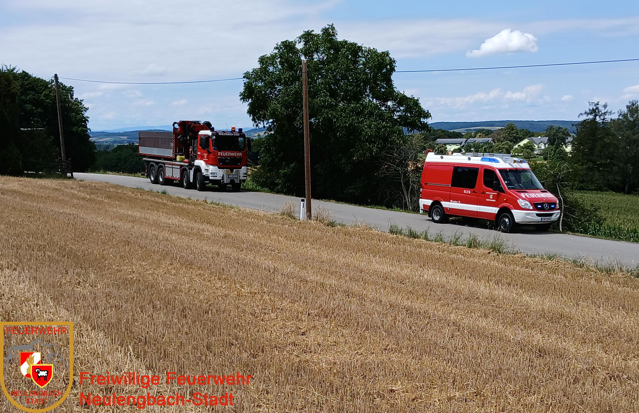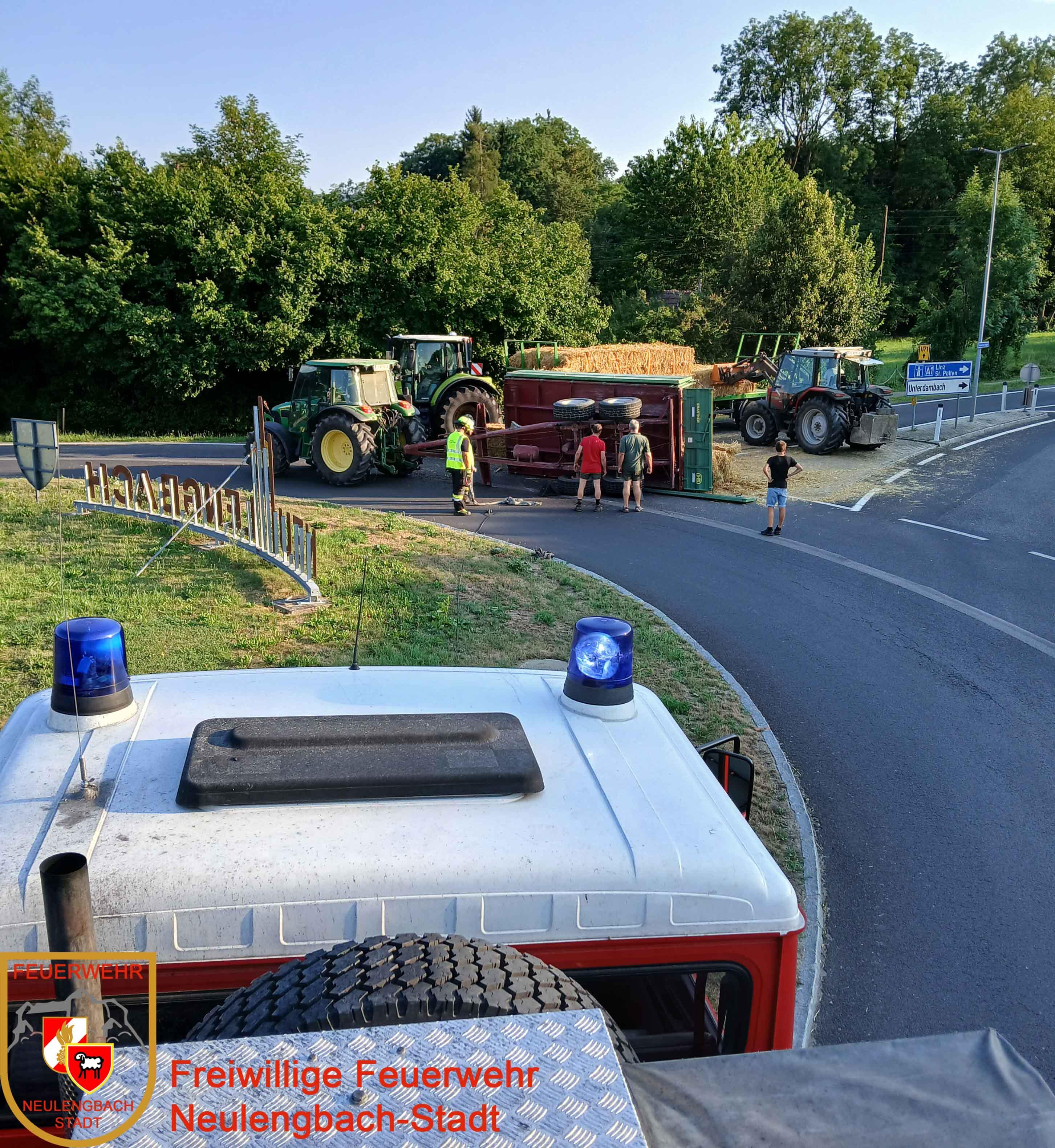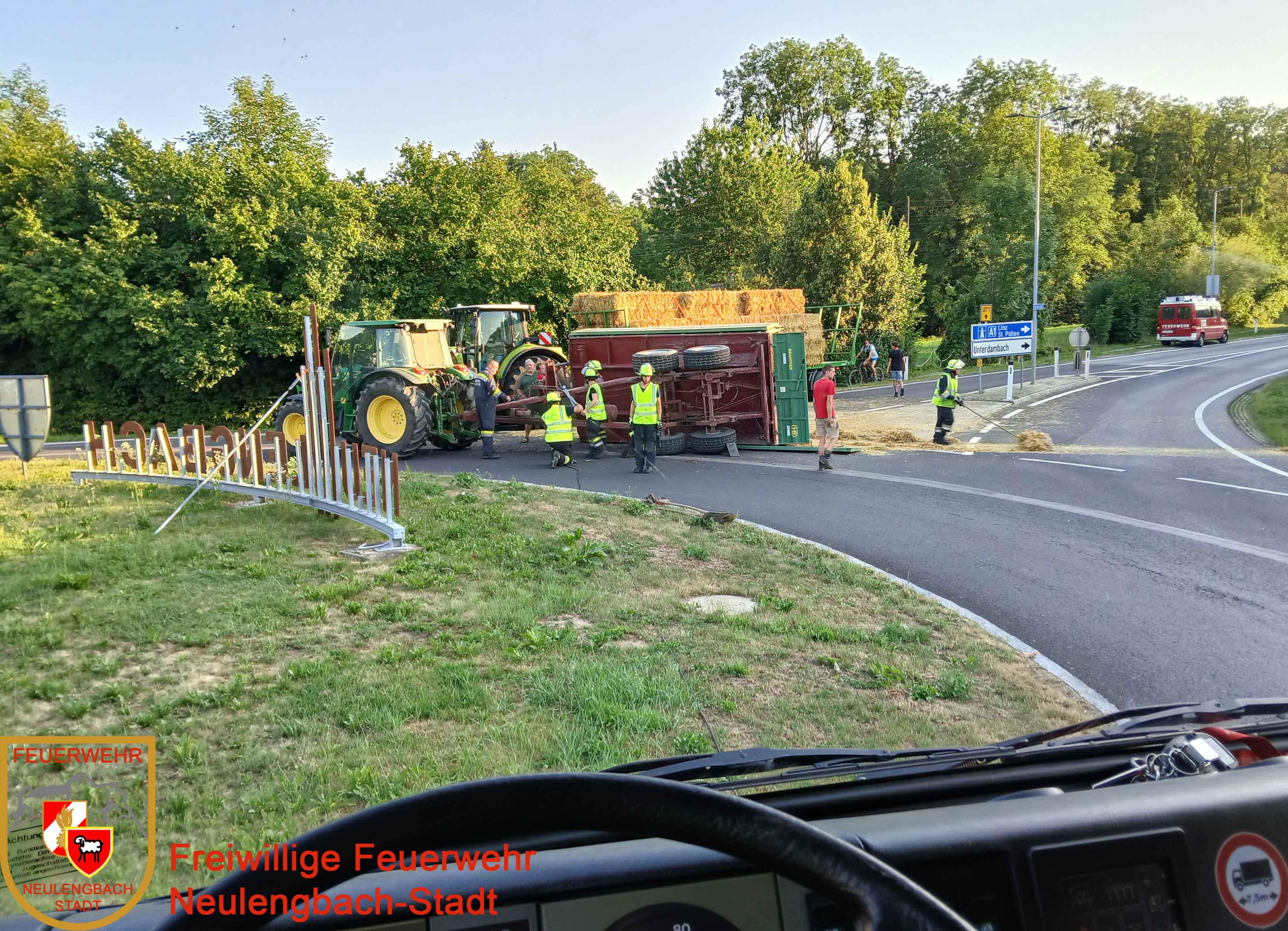 Am 15.07.2024 wurde die FF Neulengbach-Stadt um 18:54 Uhr zum Kreisverkehr beim Autobahnzubringer St.Christophen alarmiert. Dort war bei der Durchfahrt des Kreisverkehrs der mit Stroh vollbeladene Kippanhänger eines Landwirts umgekippt, glücklicherweise ohne das Zugfahrzeug mit umzureißen. So mussten zum Glück keine Verletzten versorgt werden, allerdings war die Fahrbahn mit losem und in Ballenform gepresstem Stroh übersäht. Das wurde mithilfe von Landwirten aus der Umgebung mittels Frontlader auf einen herbeigeeilten Ersatzhänger verladen.